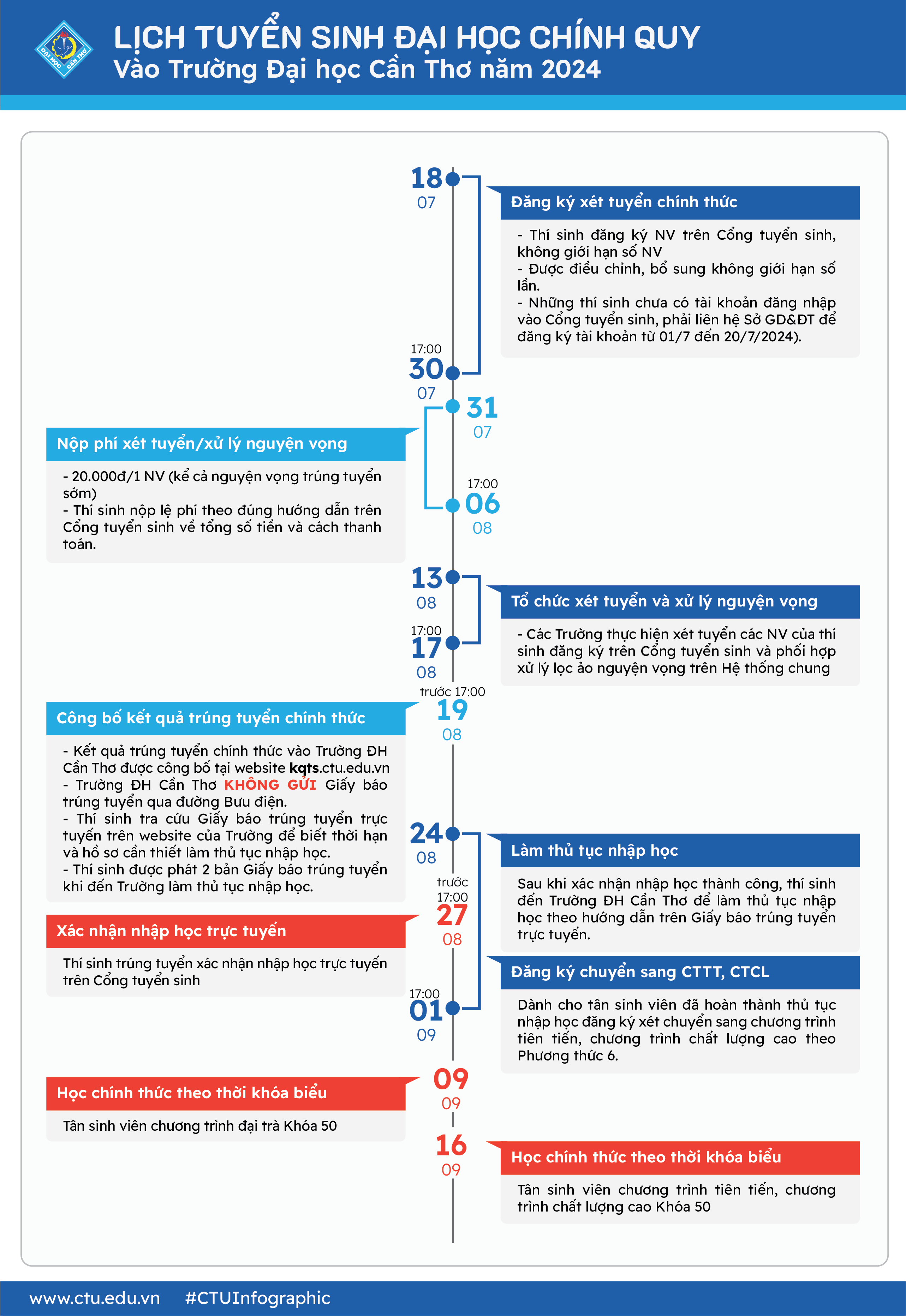 [Infographic] Một số mốc thời gian thí sinh cần lưu ý trong đợt tuyển sinh đại học chính quy vào Trường Đại học Cần Thơ năm 2024