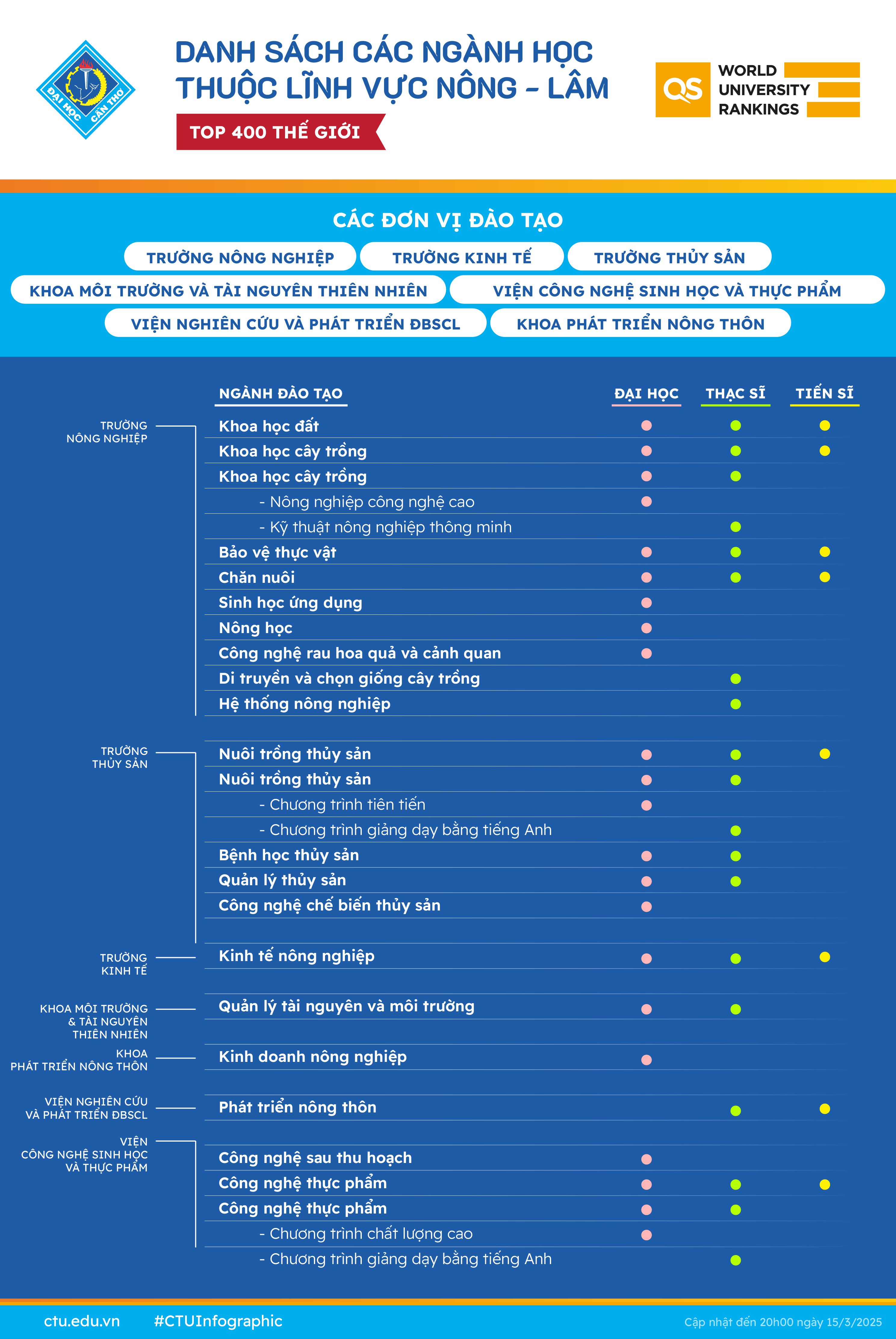 [Infographic] Nhóm ngành Nông - Lâm nghiệp, Trường Đại học Cần Thơ thuộc TOP 400 thế giới theo QS 2025