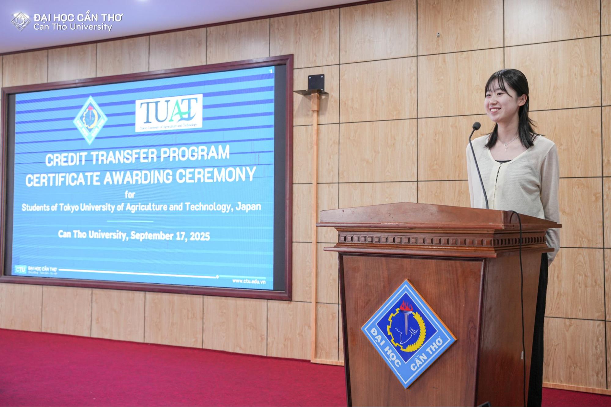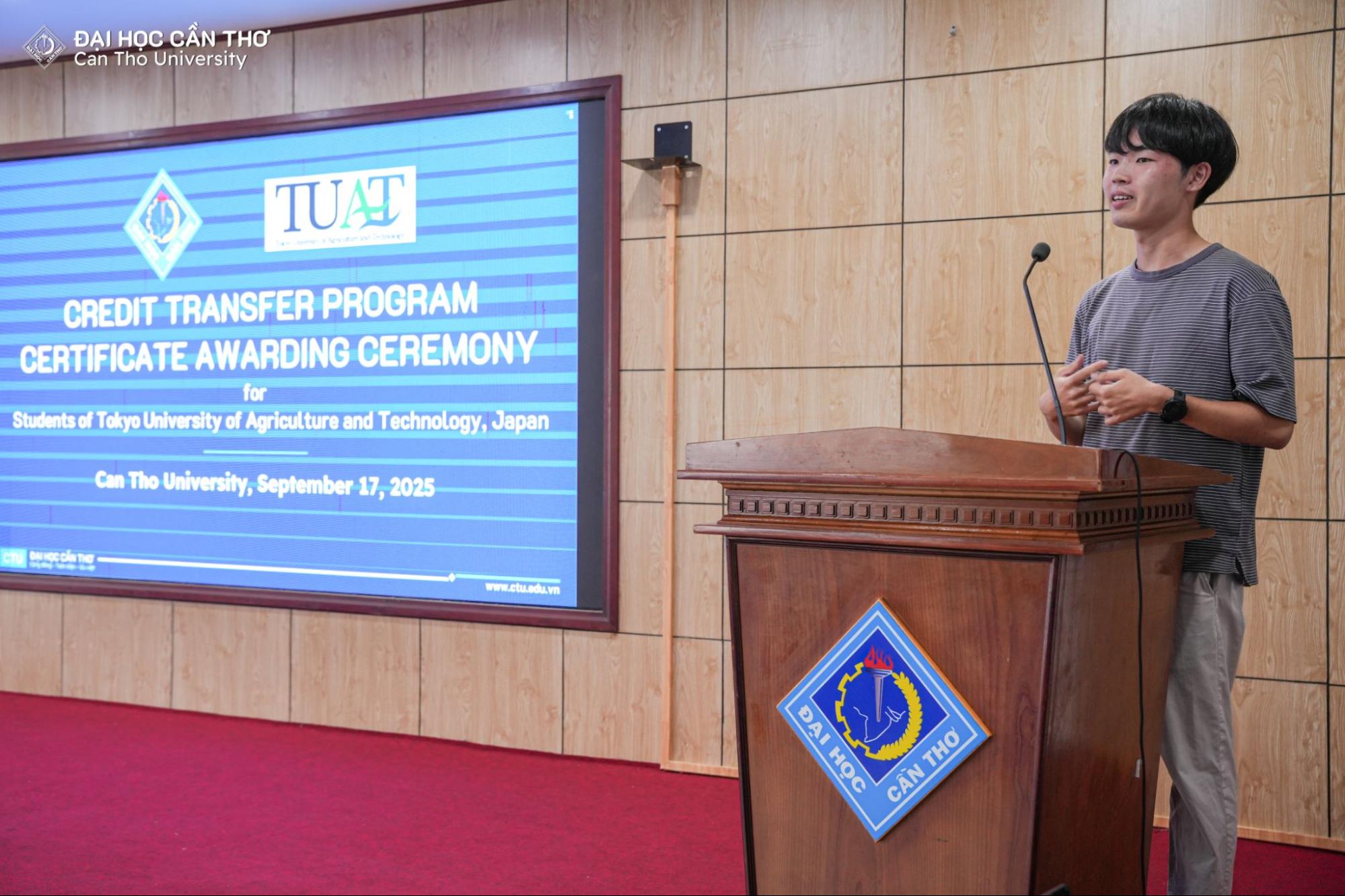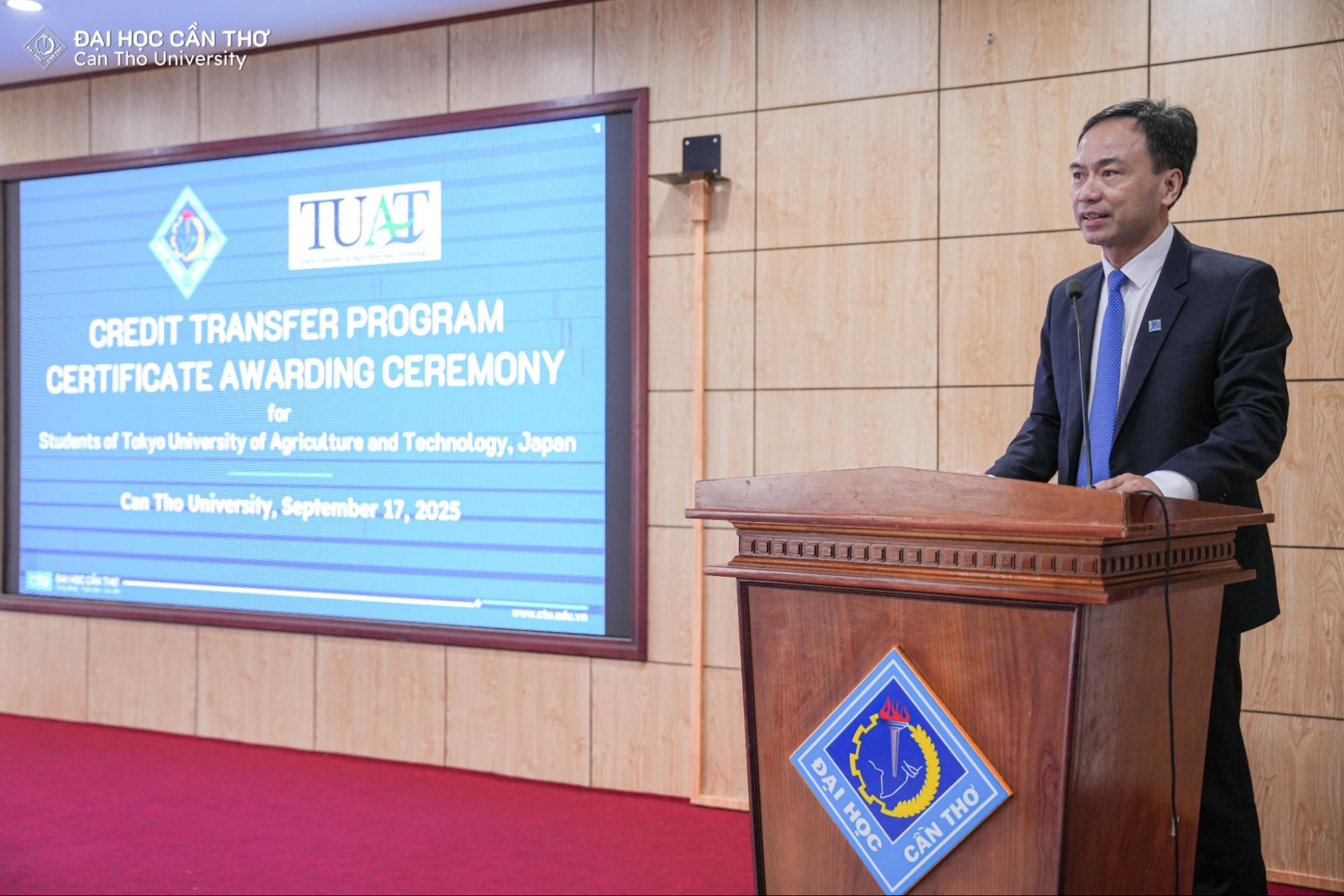 Chiều ngày 16/9/2025, Đại học Cần Thơ (ĐHCT) đã tổ chức Lễ Bế giảng chương trình trao đổi tín chỉ cho sinh viên từ Trường Đại học Nông nghiệp và Công nghệ Tokyo, Nhật Bản (Tokyo University of Agriculture and Technology - TUAT). Sự kiện có sự tham dự của TS. Lê Văn Lâm, Phó Hiệu trưởng ĐHCT cùng các thầy cô đại diện các đơn vị và các sinh viên đến từ Nhật Bản.