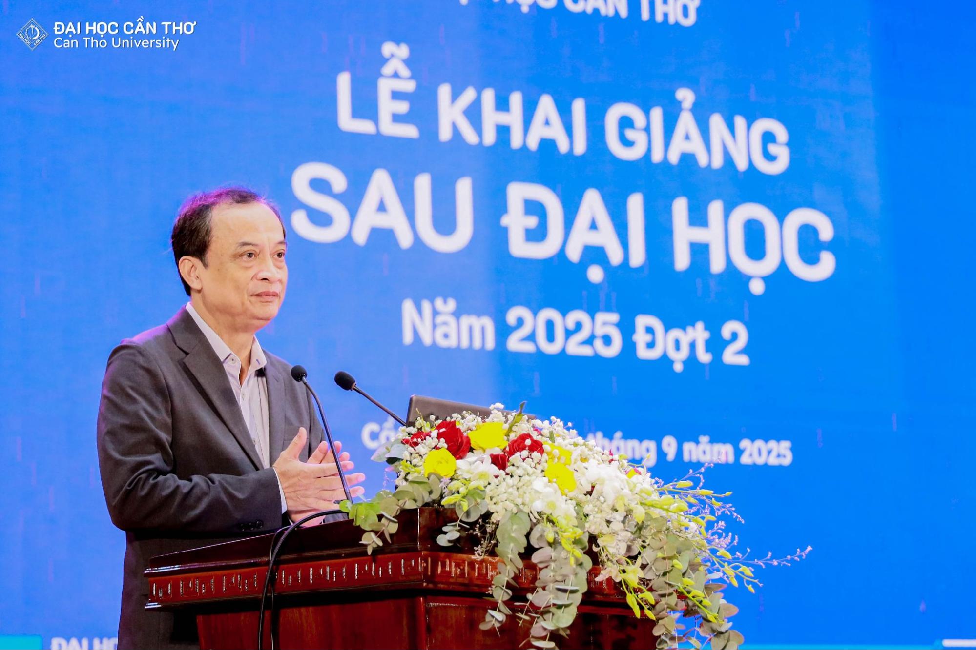 Phát biểu tại buổi lễ, GS.TS. Nguyễn Thanh Phương gửi lời chúc mừng đến các tân học viên và nghiên cứu sinh, đồng thời nhấn mạnh: “Quyết định theo học trình độ sau đại học không chỉ đơn thuần là một lựa chọn học tập, mà còn là sự cam kết đối với chính bản thân mình đó là phải kiên trì, nỗ lực để nâng cao tri thức cho bản thân, góp phần để tạo dựng giá trị mới cho cộng đồng và xã hội. Nhà trường luôn mong muốn các tân học viên và nghiên cứu sinh luôn học tập với tinh thần chủ động, tích cực sáng tạo và trách nhiệm; đồng thời, hãy luôn giữ vững đạo đức trong nghiên cứu, trung thực trong học thuật, và gắn kết tri thức với thực tiễn đời sống. ĐHCT sẽ luôn cố gắng trong công tác giảng dạy và nghiên cứu, tạo các mọi điều kiện thuận lợi cho tân học viên và nghiên cứu sinh trong học tập. Chúng tôi xác định xây dựng môi trường giáo dục mang tính khai phóng, đó là môi trường học thuật cởi mở, hiện đại; hỗ trợ tối đa trong nghiên cứu và công bố khoa học; tìm kiếm sự kết nối rộng rãi với doanh nghiệp, tổ chức trong và ngoài nước.”