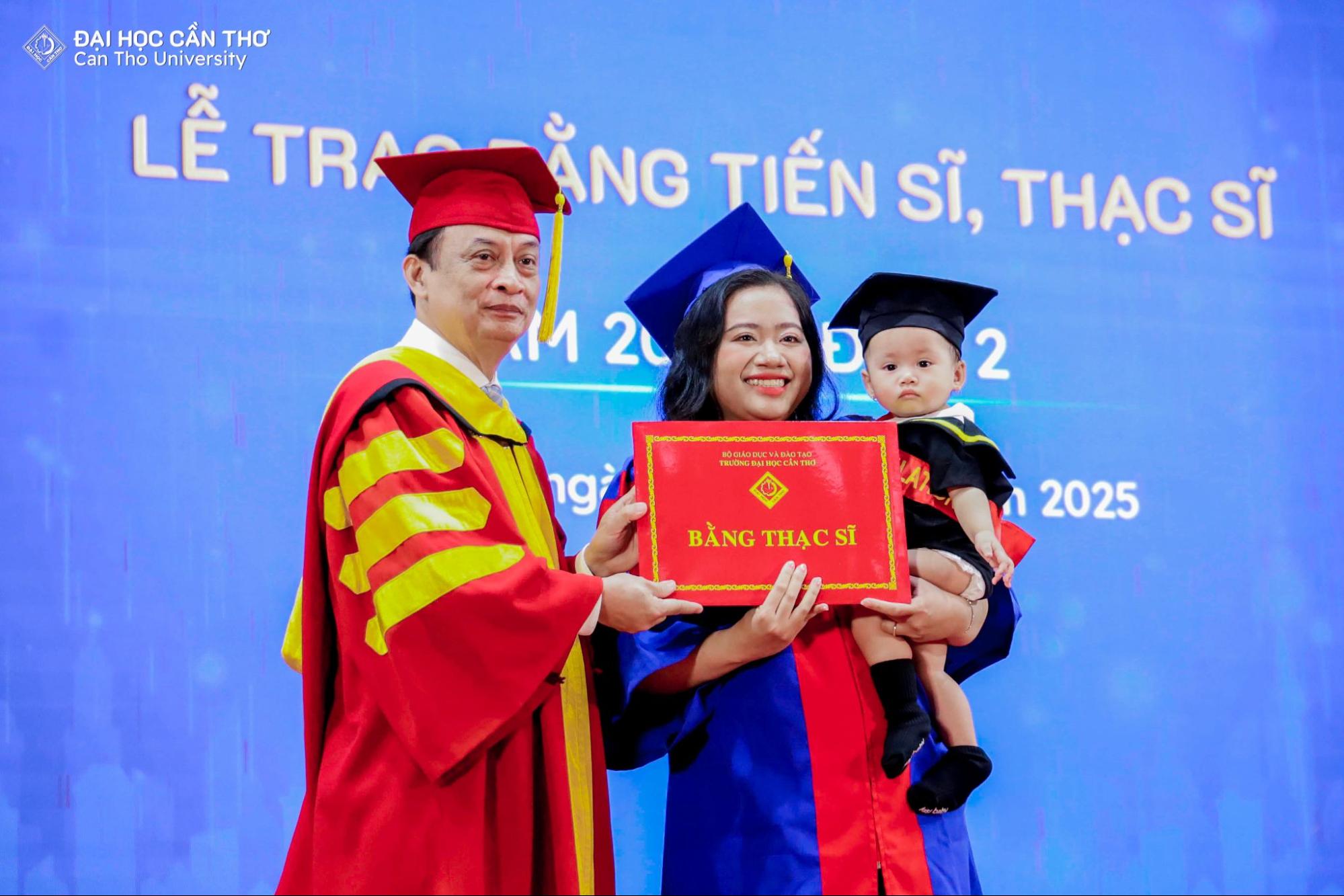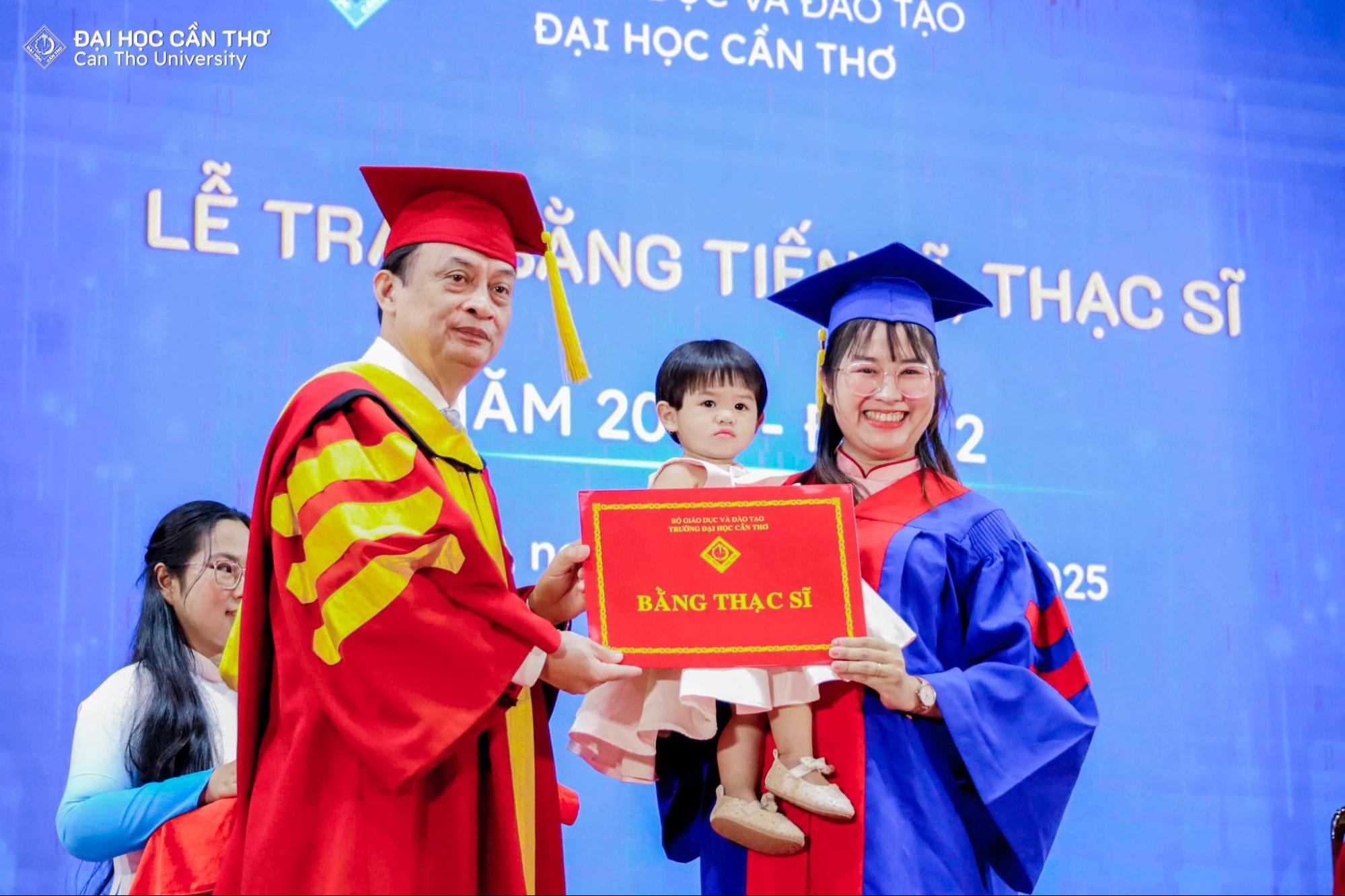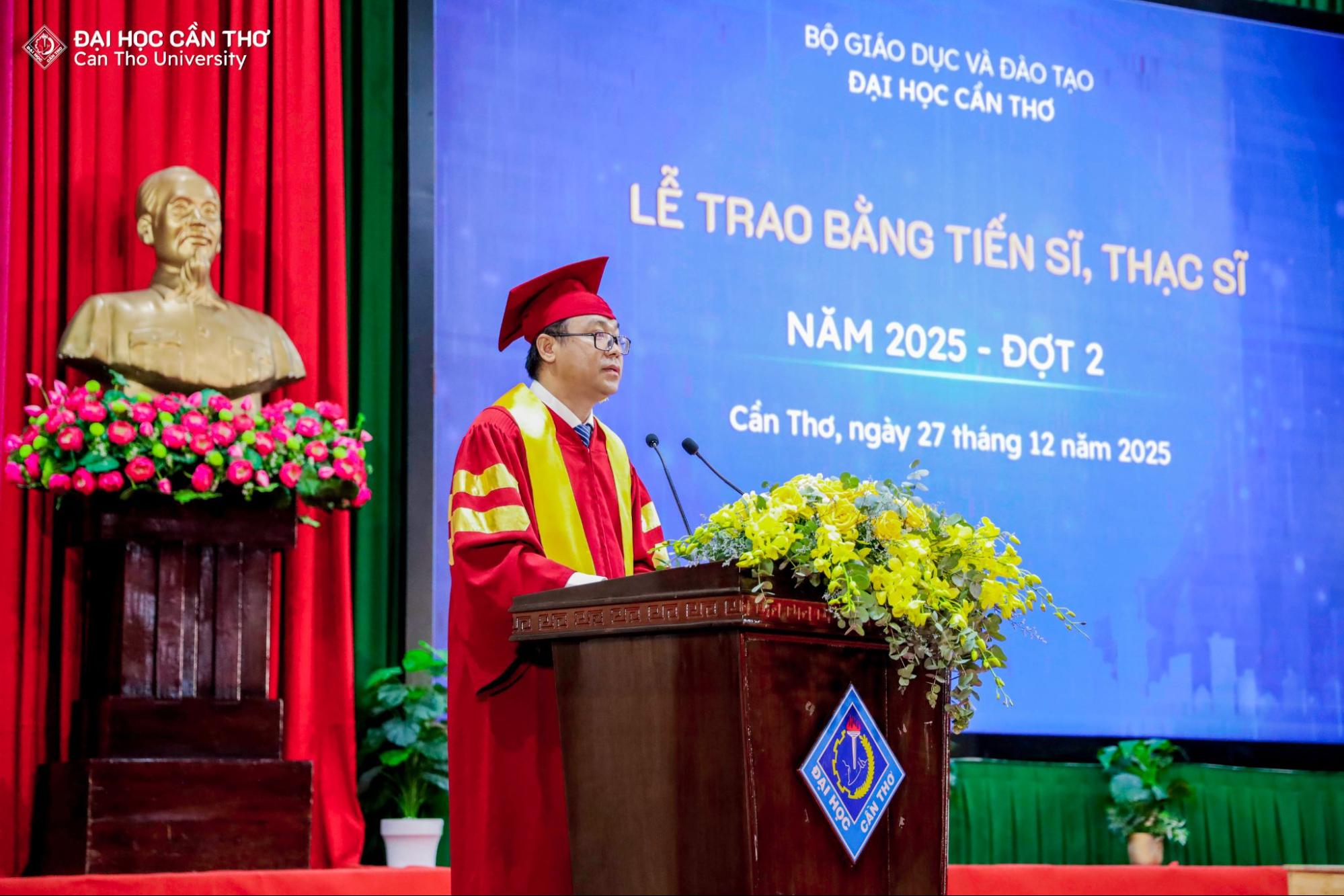 Lễ trao bằng tốt nghiệp không chỉ là sự kiện ghi nhận kết quả học tập và nghiên cứu của người học sau đại học, mà còn là dịp để tôn vinh tinh thần bền bỉ, khát vọng tri thức và trách nhiệm học thuật mà các tân khoa đã theo đuổi trong suốt quá trình đào tạo. Mỗi tấm bằng được trao là kết tinh của nỗ lực cá nhân, sự đồng hành tận tâm của đội ngũ giảng viên, cùng môi trường học thuật nghiêm túc, chuẩn mực mà ĐHCT không ngừng vun đắp. Đối với các tân tiến sĩ, thạc sĩ, đây không phải là điểm kết thúc, mà là bước khởi đầu cho hành trình cống hiến tri thức, lan tỏa giá trị học thuật và đóng góp thiết thực cho xã hội. Về phía ĐHCT, thành công của người học chính là minh chứng rõ nét cho chất lượng đào tạo và là động lực để Nhà trường tiếp tục kiên định với con đường phát triển bền vững, lấy tri thức làm nền tảng và con người làm trung tâm.