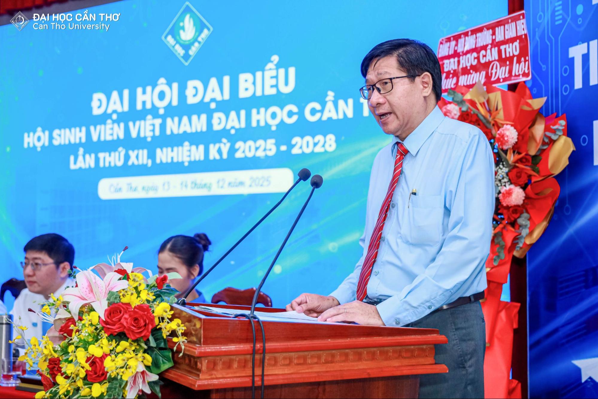 Phát biểu tại Đại hội, PGS.TS. Nguyễn Hiếu Trung khẳng định Đảng ủy và Ban Giám hiệu ĐHCT luôn đánh giá cao, ghi nhận những nỗ lực, đóng góp tích cực của tổ chức Hội Sinh viên và toàn thể sinh viên Nhà trường trong thời gian qua; đồng thời bày tỏ mong muốn sinh viên ĐHCT tiếp tục phát huy tinh thần xung kích, bản lĩnh, trí tuệ và khát vọng cống hiến của tuổi trẻ trong giai đoạn phát triển mới. Định hướng cho công tác Hội và phong trào sinh viên trong nhiệm kỳ tới, Phó Hiệu trưởng đề nghị Hội Sinh viên ĐHCT tiếp tục phối hợp chặt chẽ với Đoàn Thanh niên tổ chức đa dạng các hoạt động thiết thực, tạo môi trường thuận lợi để sinh viên rèn luyện, phấn đấu và phát triển toàn diện. Đồng thời, cần đẩy mạnh công tác giáo dục, đào tạo và định hướng lối sống lành mạnh, xây dựng lý tưởng, ý thức trách nhiệm cho sinh viên; tăng cường phối hợp với các phòng, ban chức năng trong Nhà trường nhằm khuyến khích sinh viên chủ động tự học, nghiên cứu khoa học, đổi mới sáng tạo gắn với chuyển đổi số. Bên cạnh đó, Hội Sinh viên cần phát huy tốt vai trò cầu nối giữa Nhà trường và địa phương, góp phần tuyên truyền, quảng bá hình ảnh quê hương, đồng thời đẩy mạnh chuyển giao và ứng dụng khoa học – công nghệ phục vụ phát triển cộng đồng.