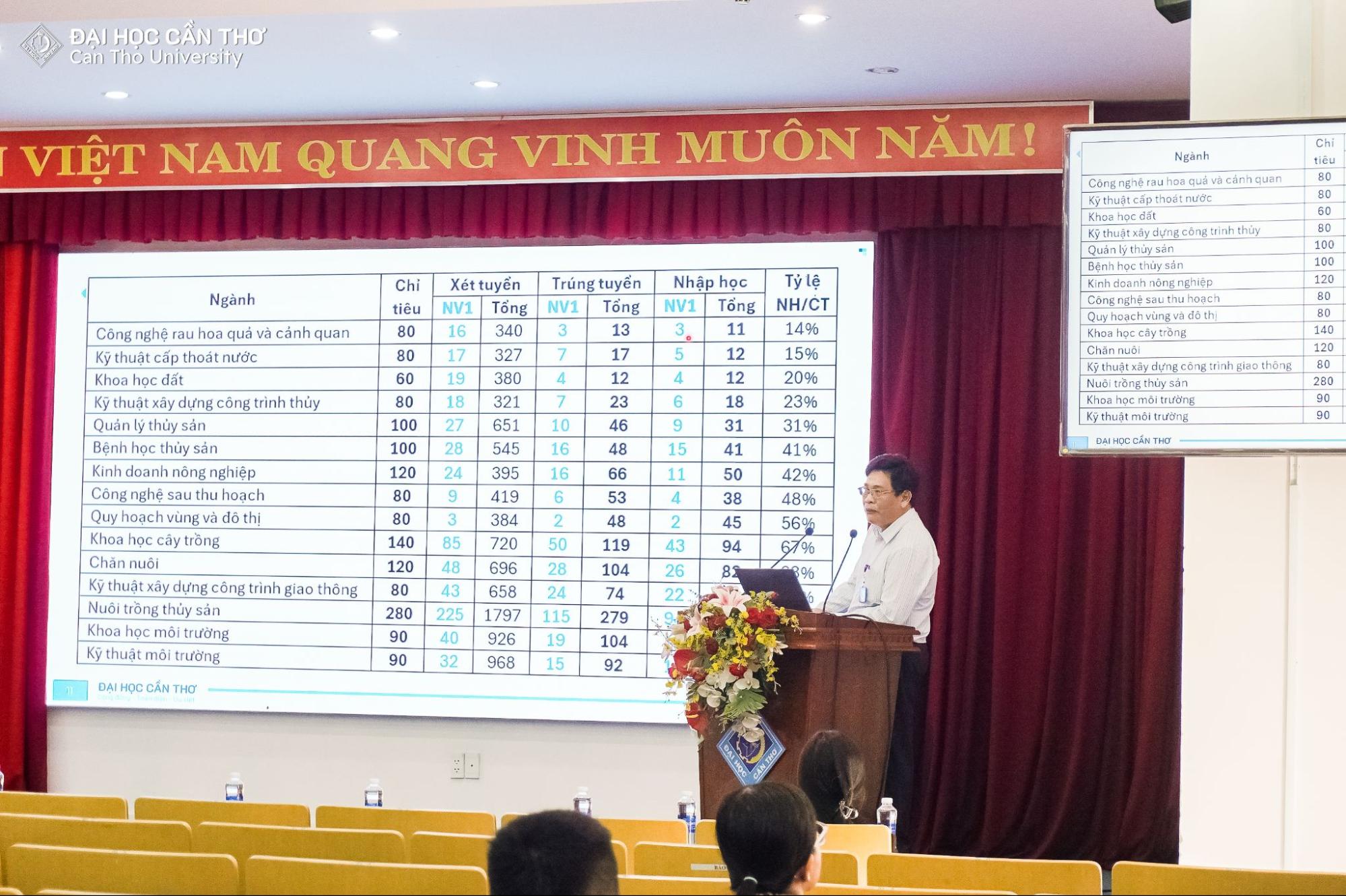 Với 121 mã ngành xét tuyển đại học chính quy, ĐHCT chào đón 10.178 thí sinh trúng tuyển xác nhận nhập học chính thức tại trường, đạt 96% chỉ tiêu đề ra. Bên cạnh đó, trong phiên báo cáo của TS. Phạm Thị Ngọc Sương - Phó Giám đốc Trung tâm Đào tạo liên tục cho biết, công tác tổ chức tuyển sinh đại học ngoài chính quy của Nhà trường luôn nhận được sự hợp tác chặt chẽ, đáng tin cậy và đồng bộ với các đơn vị liên kết đào tạo trong và ngoài khu vực. Chương trình Đào tạo từ xa và hình thức Vừa làm Vừa học ngày càng được đón nhận, đáp ứng nhu cầu học tập linh hoạt của đa dạng nhóm học viên.
