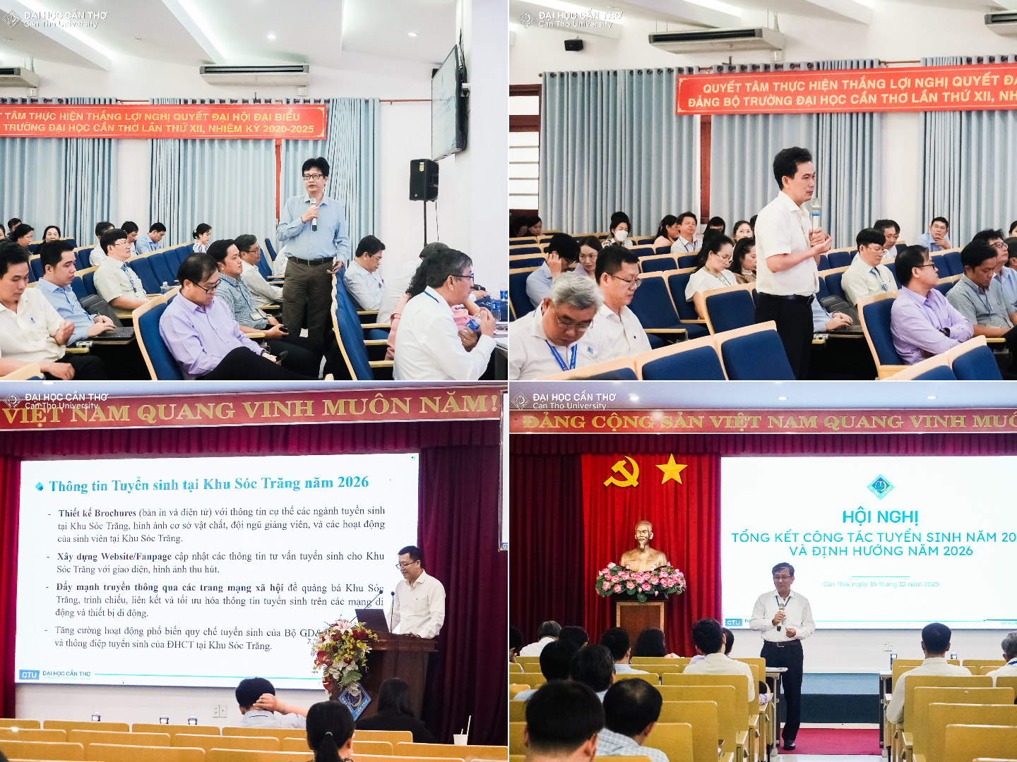 Chiều ngày 16/12/2025, tại Nhà Điều hành, Đại học Cần Thơ (ĐHCT), Hội nghị Tổng kết công tác tuyển sinh năm 2025 và triển khai phương hướng nhiệm vụ năm 2026 do Phòng Đào tạo phối hợp với Khoa Sau Đại học, Khoa Dự bị đại học tổ chức đã diễn ra thành công tốt đẹp. Tham dự Hội nghị có PGS.TS. Trần Trung Tính - Hiệu trưởng; GS.TS. Trần Thị Thanh Hiền - Nguyên Phó Hiệu trưởng ĐHCT; lãnh đạo các đơn vị đào tạo trực thuộc; đại diện các phòng, ban chức năng cùng cán bộ, giảng viên phụ trách đào tạo, công tác tư vấn, tuyển sinh.