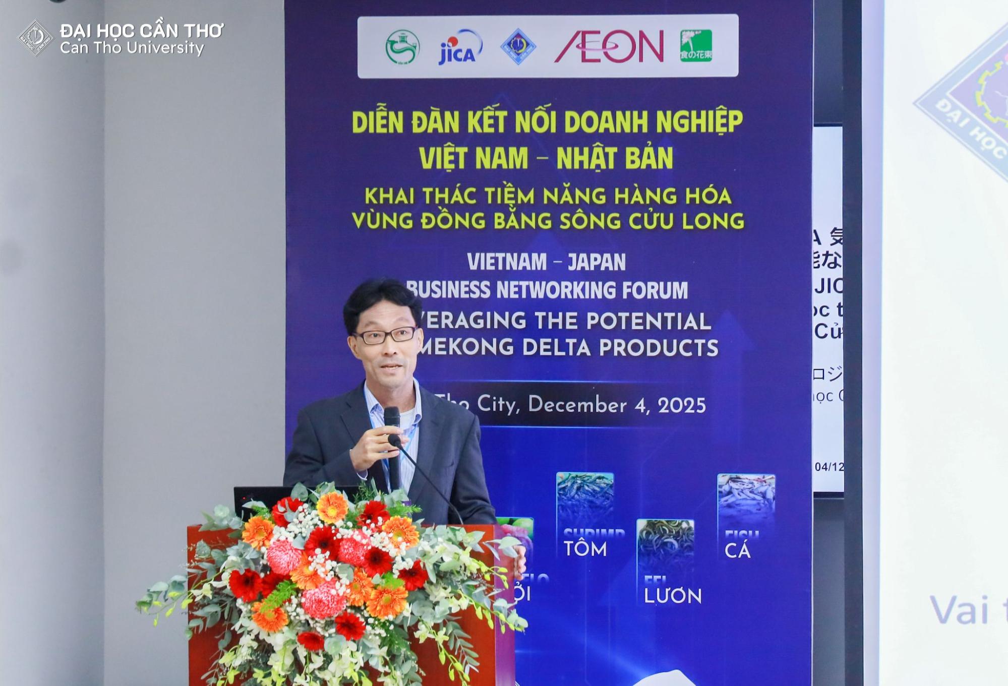 Nhật Bản từ lâu được xem là đối tác chiến lược hàng đầu của Việt Nam trong nhiều lĩnh vực, và JICA giữ vai trò then chốt trong việc thúc đẩy các dự án hợp tác phát triển, đặc biệt tại khu vực ĐBSCL. Trong nhiều năm qua, ĐHCT và JICA đã cùng triển khai nhiều dự án quy mô lớn, góp phần phát triển nguồn nhân lực chất lượng cao, xây dựng cơ sở hạ tầng giáo dục hiện đại và tạo lập môi trường kết nối doanh nghiệp bền vững cho vùng. Tại Diễn đàn, ông Imai Junichi, Điều phối viên Dự án Hỗ trợ kỹ thuật pha 2 JICA-ĐHCT, đã trình bày báo cáo với chủ đề: “Thúc đẩy kết nối doanh nghiệp Nhật Bản vì sự phát triển bền vững vùng ĐBSCL”, nhấn mạnh vai trò của hợp tác quốc tế trong việc nâng cao năng lực sản xuất, thương mại hóa sản phẩm và phát triển bền vững cho khu vực.