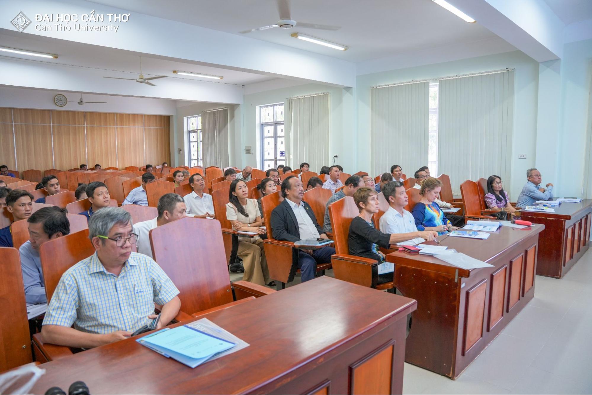 Hội thảo vinh dự đón tiếp Ban quản lý dự án từ Tổ chức CSIRO, Úc - Bà Kelly Jennifer, Bà Cosijn Michaela và PGS.TS. Nguyễn Nguyên Minh. Về phía ĐHCT có GS.TS. Trần Ngọc Hải, Phó Hiệu trưởng ĐHCT – Chủ nhiệm dự án; và PGS.TS. Nguyễn Hiếu Trung, Phó Hiệu trưởng ĐHCT; GS.TS. Vũ Ngọc Út, Hiệu trưởng Trường Thủy sản, ĐHCT và các thành viên ban chủ nhiệm dự án cùng tham dự. Về phía địa phương, có bà Quách Thị Thanh Bình – Phó Giám đốc Sở Nông nghiệp và Môi trường Thành phố Cần Thơ; ông Thái Trường Giang – Phó Giám đốc Sở Khoa học và Công nghệ tỉnh Cà Mau; ông Châu Hữu Trị - Giám đốc Trung tâm Khuyến nông tỉnh Vĩnh Long; ông Tiết Tiến Dũng – Giám đốc Trung tâm Khuyến nông tỉnh Cà Mau; và các lãnh đạo Chi cục thủy sản các tỉnh Cà Mau, Cần Thơ, An Giang, Đồng Tháp, Vĩnh Long.