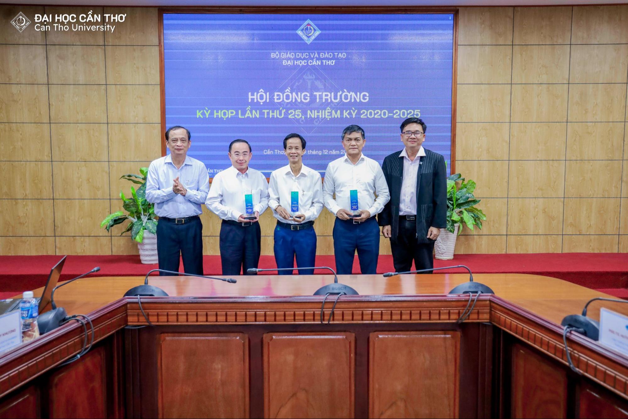 GS.TS. Nguyễn Thanh Phương - Bí thư Đảng ủy, Chủ tịch Hội đồng Trường (bìa trái) và GS.TS. Nguyễn Chí Ngôn - Ủy viên Ban Thường vụ Đảng ủy, Phó Chủ tịch Hội đồng Trường (bìa phải) trao biểu trưng tri ân các thành viên Hội đồng Trường có nhiều đóng góp cho sự phát triển của ĐHCT trong nhiệm kỳ