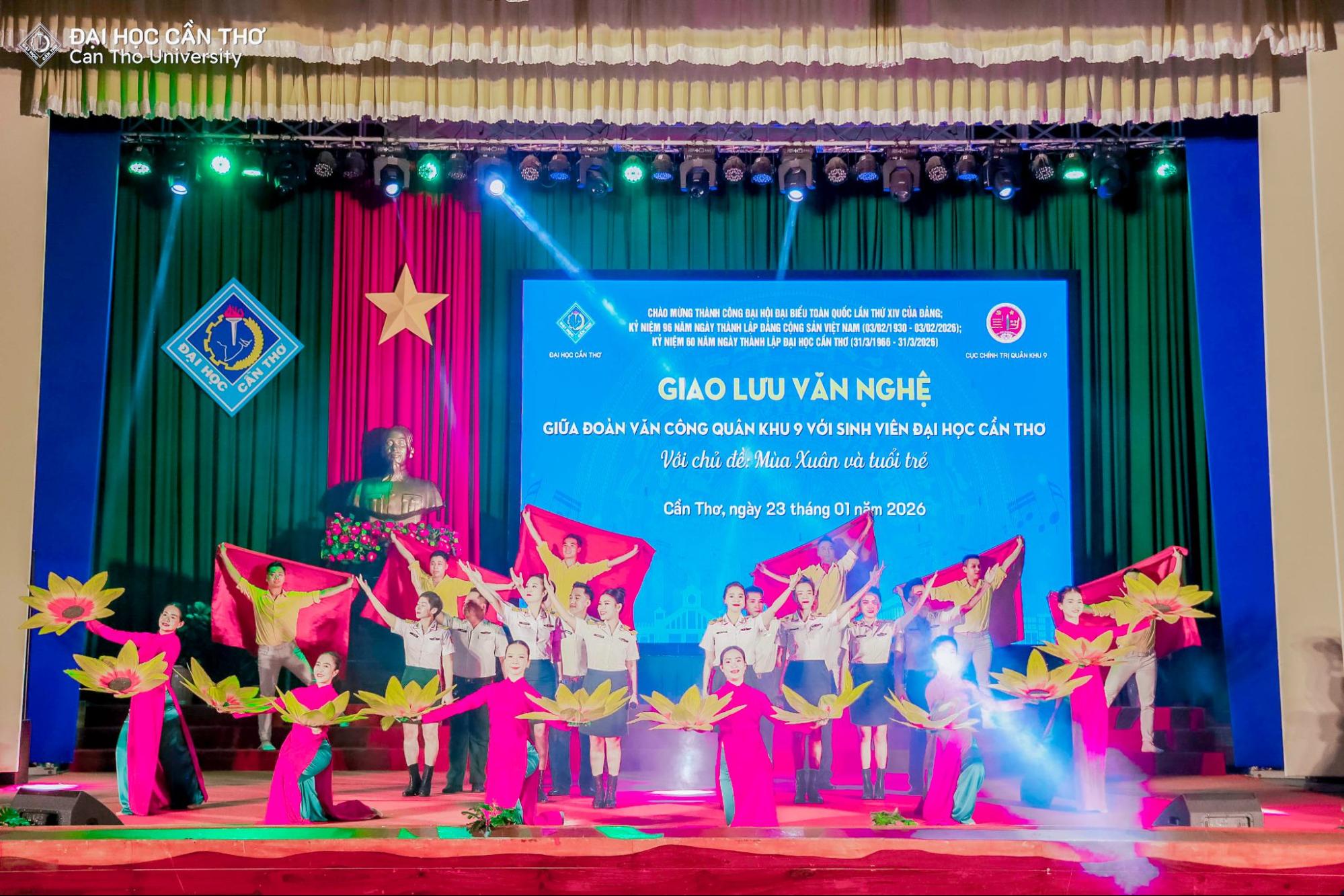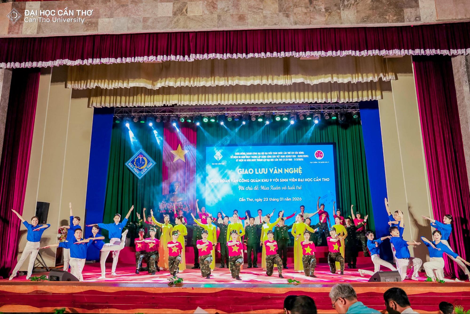 Nhằm chào mừng thành công Đại hội đại biểu toàn quốc lần thứ XIV của Đảng Cộng sản Việt Nam, hướng tới kỷ niệm 96 năm Ngày thành lập Đảng (03/02/1930 – 03/02/2026), 60 năm Ngày thành lập Đại học Cần Thơ (31/3/1966 - 31/3/2026) và đón chào Xuân Bính Ngọ 2026, tối ngày 23/01/2026 tại Hội trường Rùa, Đại học Cần Thơ (ĐHCT) phối hợp cùng Cục Chính trị Quân khu 9 tổ chức chương trình giao lưu văn nghệ với chủ đề “Mùa xuân và Tuổi trẻ”.
