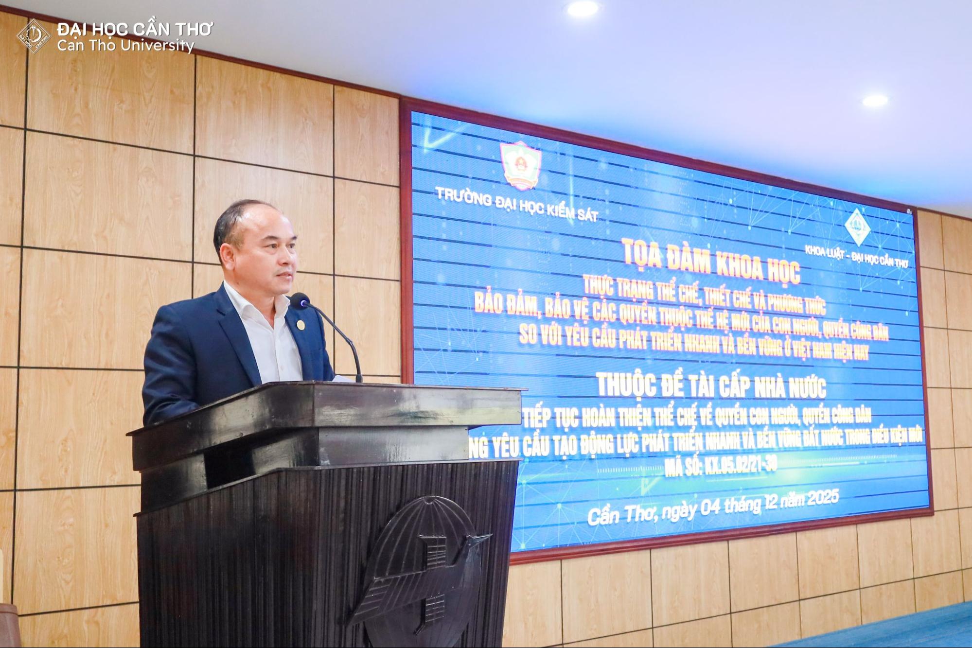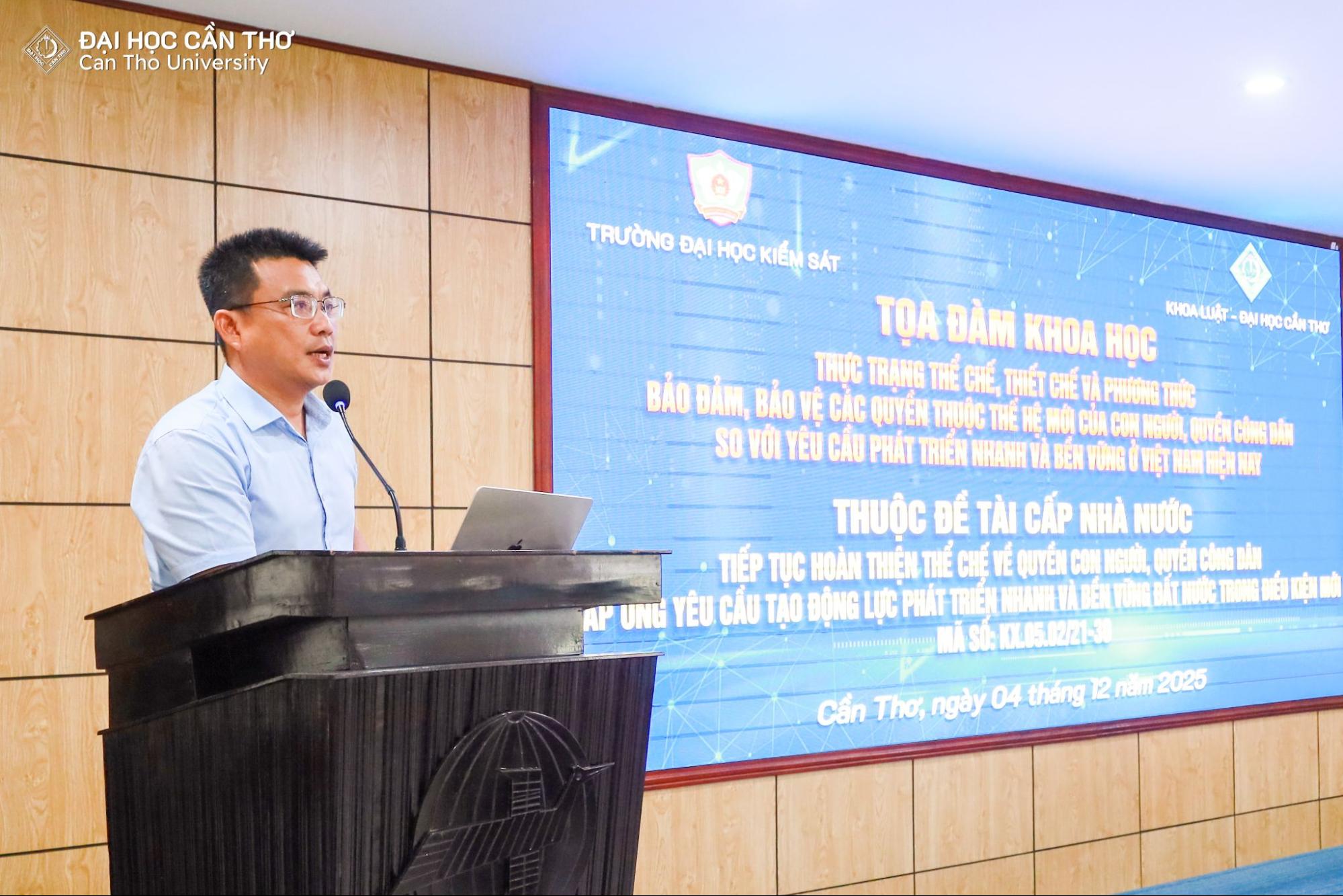 Ngày 04/12/2025, Khoa Luật, Đại học Cần Thơ (ĐHCT) phối hợp với Trường Đại học Kiểm sát tổ chức Tọa đàm khoa học cấp quốc gia với chủ đề “Thực trạng thể chế, thiết chế và phương thức bảo đảm, bảo vệ các quyền thuộc thế hệ mới của con người, quyền công dân so với yêu cầu phát triển nhanh và bền vững ở Việt Nam hiện nay”.