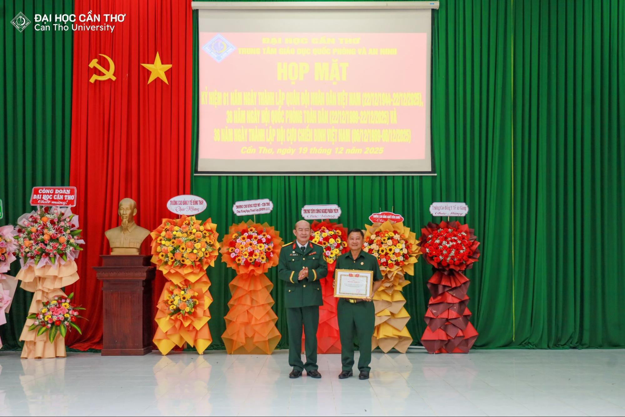 Chiều ngày 19/12/2025, Trung tâm Giáo dục Quốc phòng và An ninh – Đại học Cần Thơ (ĐHCT) đã long trọng tổ chức buổi “Họp mặt kỷ niệm 81 năm Ngày thành lập Quân đội Nhân dân Việt Nam (22/12/1944 – 22/12/2025), 36 năm Ngày hội Quốc phòng toàn dân (22/12/1989 – 22/12/2025) và 36 năm Ngày truyền thống Hội Cựu chiến binh Việt Nam (06/12/1989 – 06/12/2025)”. Chương trình được tổ chức trong không khí trang nghiêm, ấm áp và đầy tự hào, hòa cùng khí thế thi đua sôi nổi của toàn Đảng, toàn dân và toàn quân hướng tới các ngày lễ lớn của đất nước, đồng thời là dịp ý nghĩa để ôn lại truyền thống anh hùng, vẻ vang của Quân đội Nhân dân Việt Nam và các thế hệ Cựu chiến binh (CCB) qua các thời kỳ.