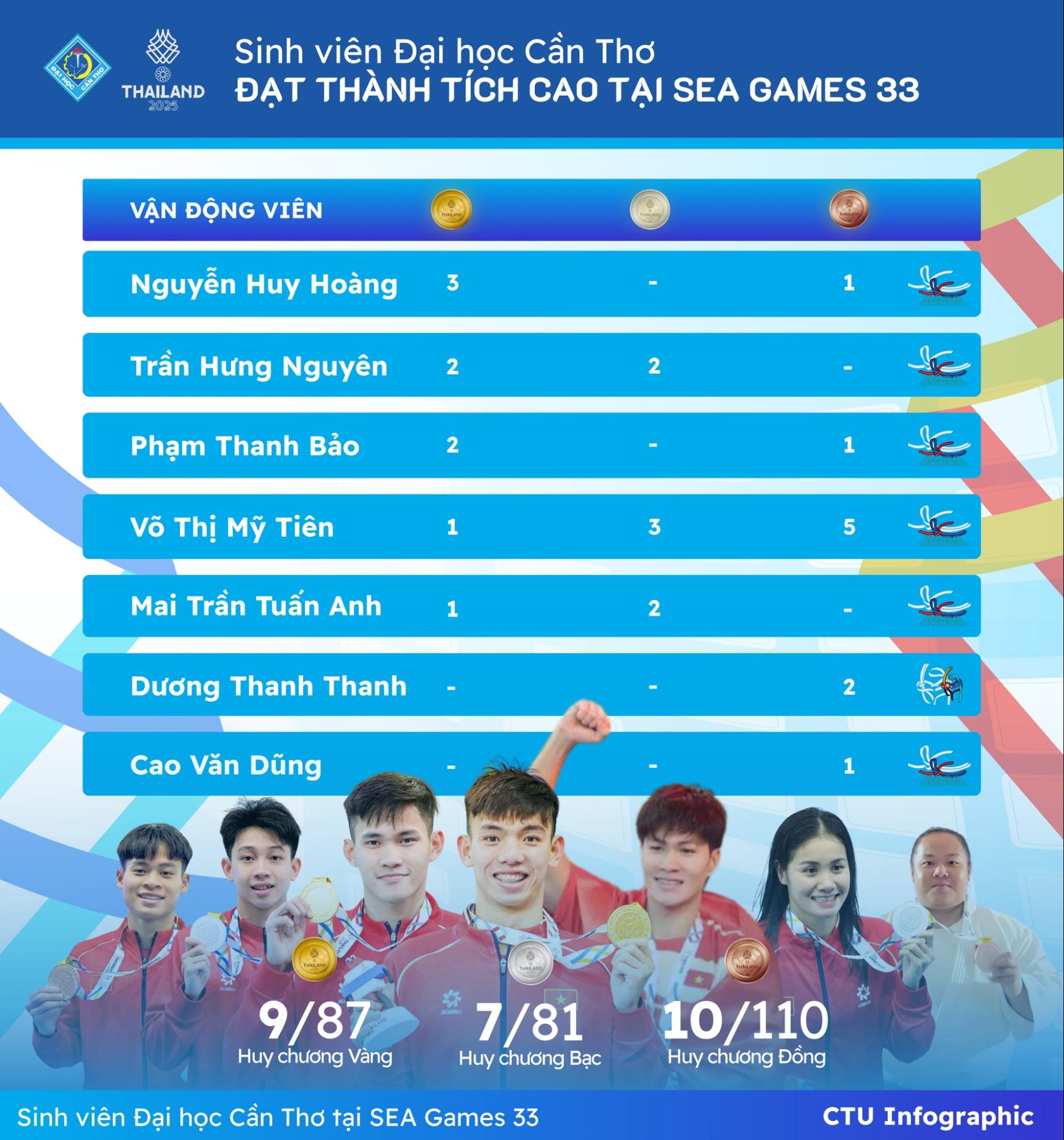 Tại SEA Games 2025, sinh viên Nhà trường đã xuất sắc ghi dấu ấn đậm nét trên đấu trường thể thao khu vực, đóng góp quan trọng vào thành tích chung của Đoàn Thể thao Việt Nam. Với 9 Huy chương Vàng, 7 Huy chương Bạc và 10 Huy chương Đồng, các vận động viên là sinh viên ĐHCT đã đóng góp tích cực vào thành tích xếp hạng thứ ba toàn đoàn của Đoàn thể thao Việt Nam. Những thành tích này không chỉ mang lại vinh quang cho Tổ quốc, mà còn lan tỏa niềm tự hào, tinh thần cống hiến và ý chí vươn lên mạnh mẽ của tuổi trẻ ĐHCT.