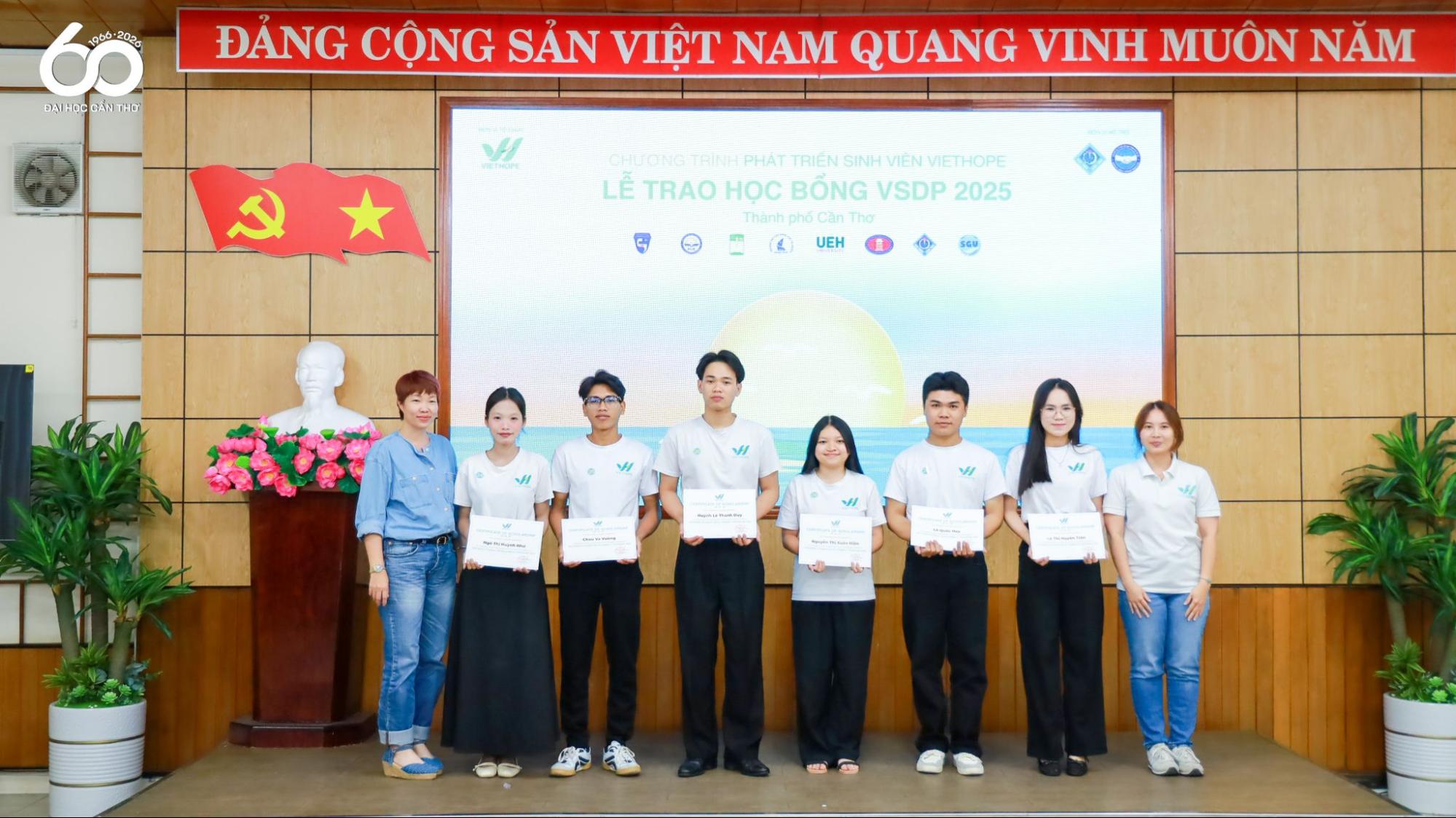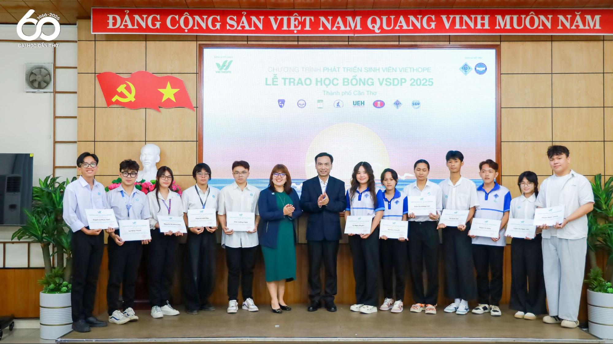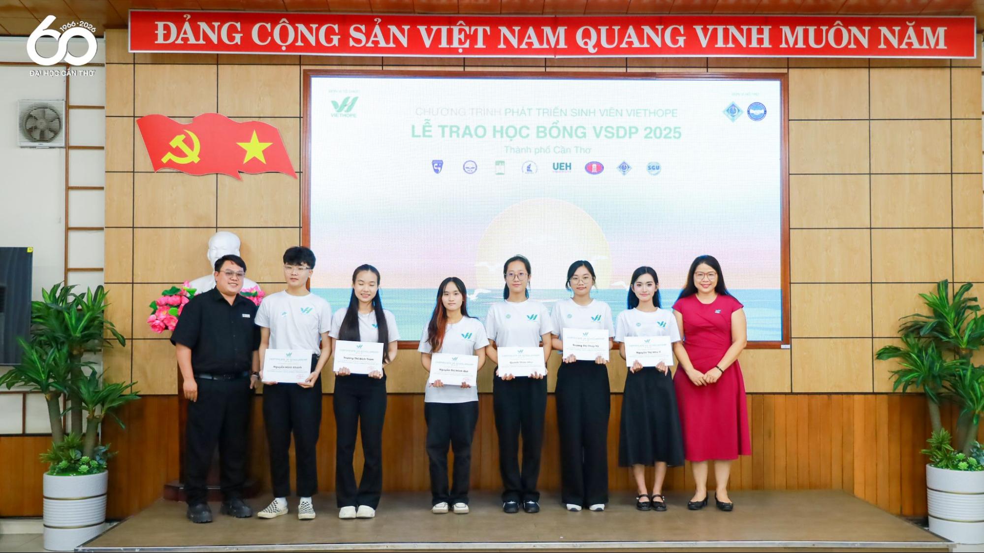 Tại Hội trường Trường Công nghệ Thông tin và Truyền thông, Đại học Cần Thơ (ĐHCT) đã tổ chức Lễ trao học bổng VSDP (VietHope Student Development Program - Chương trình Phát triển Sinh viên VietHope) năm 2025 dành cho sinh viên có hoàn cảnh khó khăn, nỗ lực vươn lên trong học tập. Chương trình nhằm kịp thời động viên, tiếp sức cho sinh viên trên hành trình học tập và phát triển bản thân, đồng thời thể hiện sự gắn kết giữa Nhà trường và các tổ chức xã hội trong công tác hỗ trợ người học.