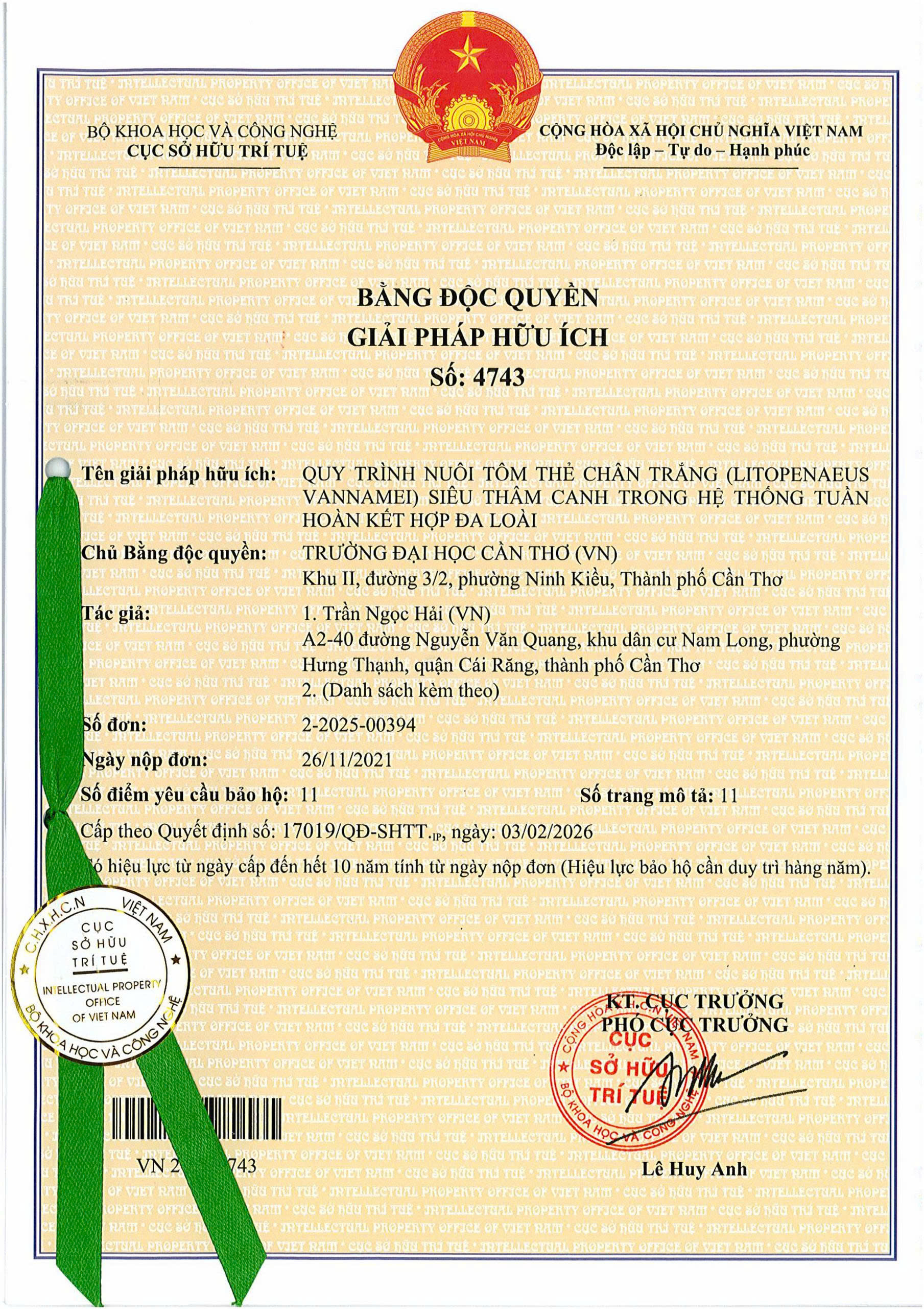 Cụ thể, Nhà trường đã được cấp Bằng độc quyền Giải pháp hữu ích số 4743 cho công trình “Quy trình nuôi tôm thẻ chân trắng (Litopenaeus vannamei) siêu thâm canh trong hệ thống tuần hoàn kết hợp đa loài”. Đây là kết quả nghiên cứu của nhóm tác giả do GS.TS. Trần Ngọc Hải cùng các giảng viên Trường Thủy sản thực hiện. Giải pháp này có ý nghĩa thực tiễn cao, góp phần nâng cao hiệu quả sản xuất, tối ưu tài nguyên và hướng tới phát triển bền vững ngành nuôi trồng thủy sản tại Đồng bằng sông Cửu Long.