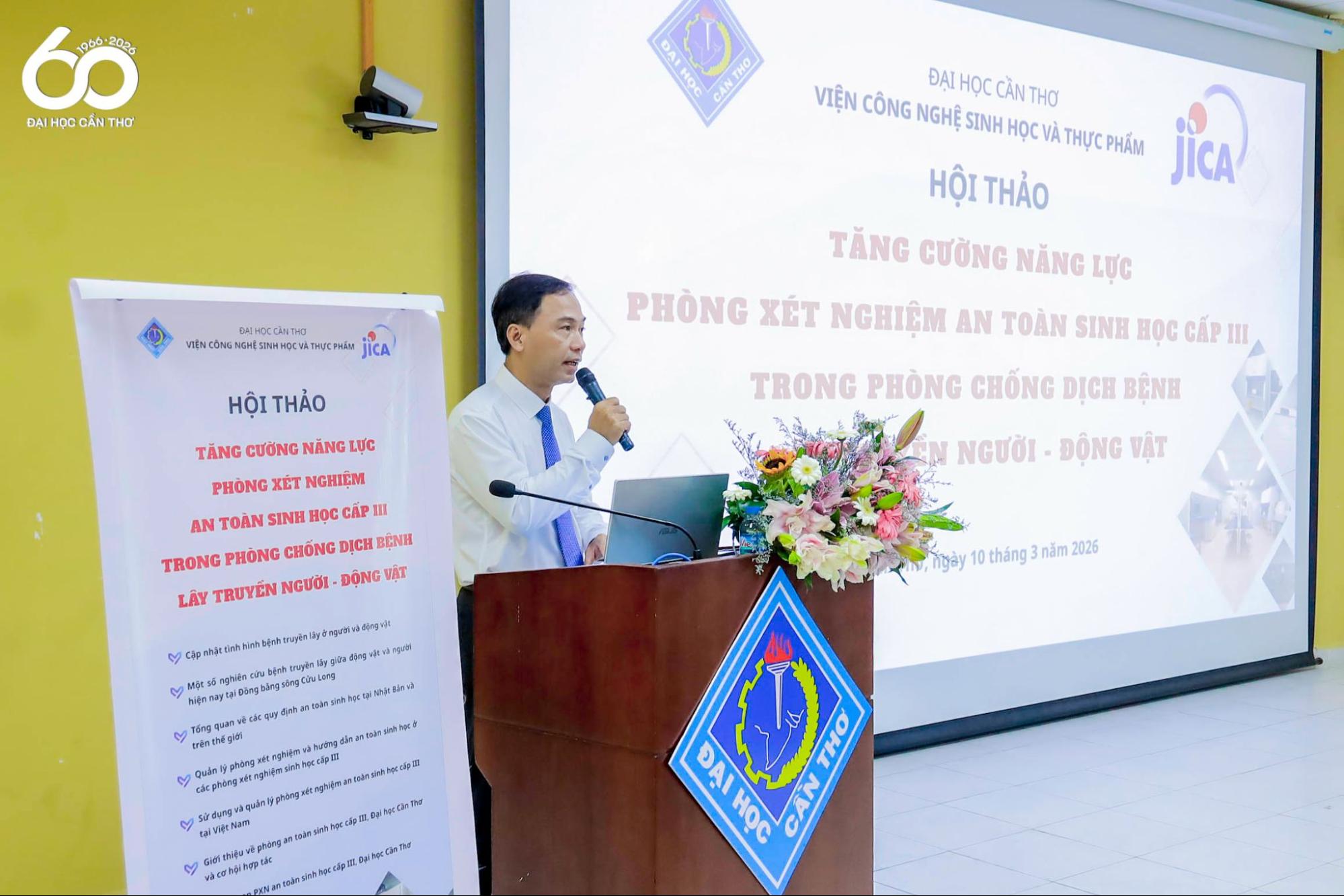 Sáng ngày 10/3/2026, Đại học Cần Thơ (ĐHCT) phối hợp với Văn phòng Cơ quan Hợp tác Quốc tế Nhật Bản (JICA) Việt Nam tổ chức Hội thảo “Tăng cường năng lực Phòng thí nghiệm An toàn sinh học Cấp III trong phòng chống dịch bệnh lây truyền Người – động vật”. Chương trình được tổ chức với mục tiêu chia sẻ kinh nghiệm trong nước và quốc tế; cập nhật kiến thức chuyên môn; thảo luận các giải pháp nâng cao năng lực nghiên cứu; giám sát, phòng chống dịch bệnh lây truyền giữa người và động vật.