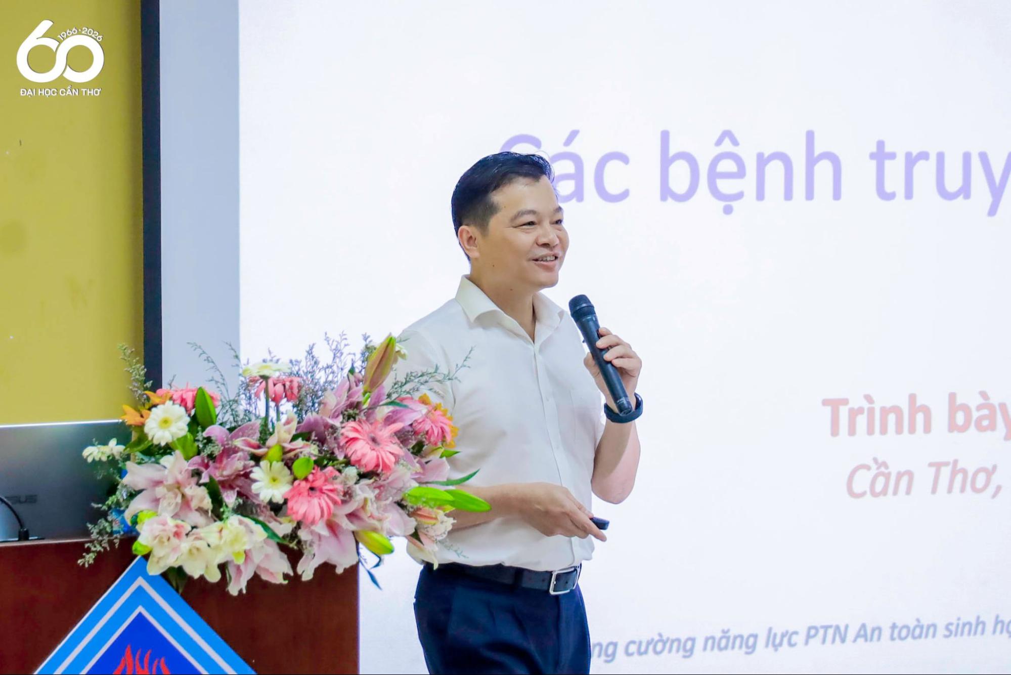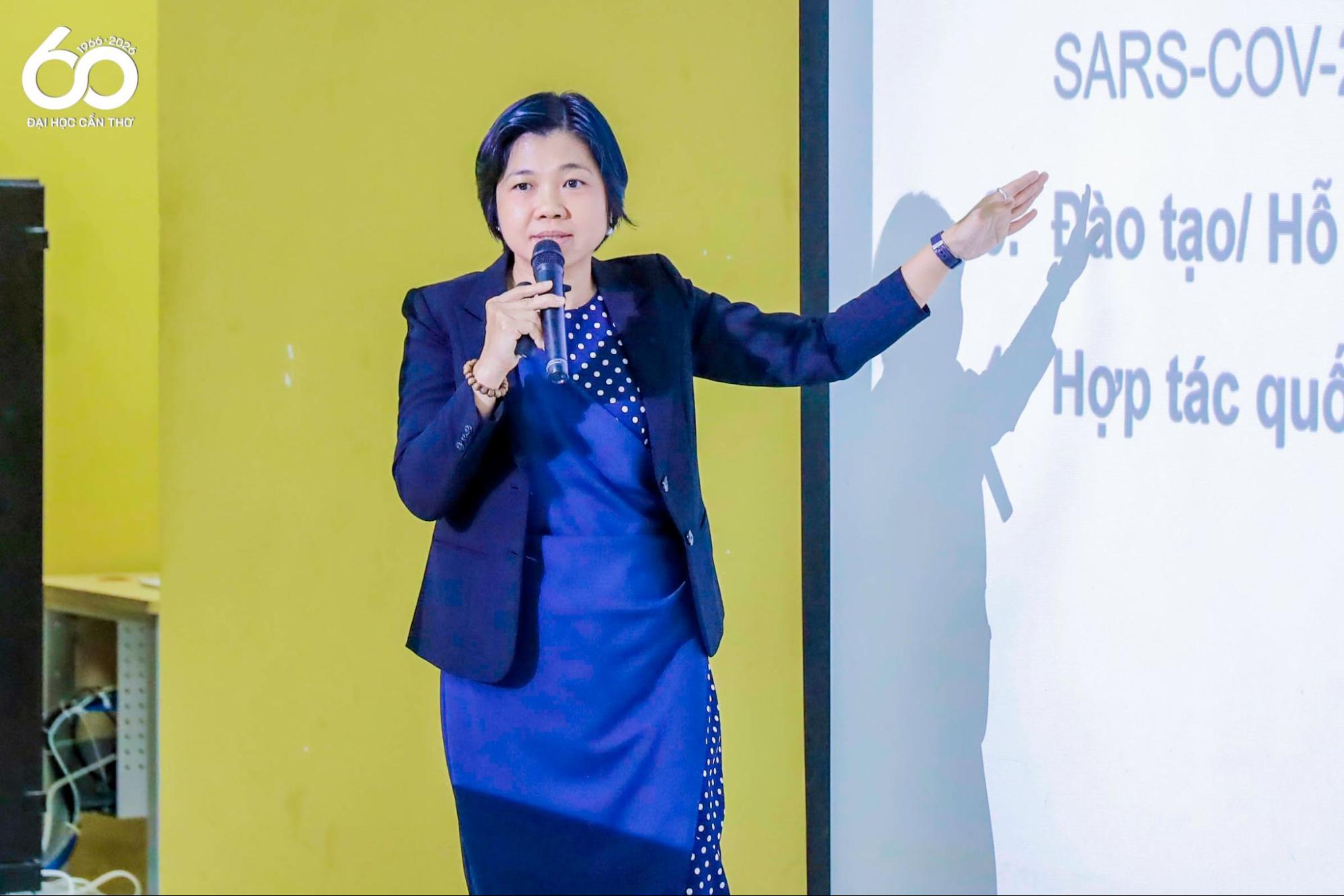 Đại diện Viện Công nghệ Sinh học và Thực phẩm - ĐHCT, PGS.TS. Đỗ Tấn Khang – Trưởng Bộ môn Sinh học Phân tử giới thiệu về Phòng thí nghiệm an toàn sinh học cấp III của ĐHCT, đồng thời chia sẻ định hướng nghiên cứu và các cơ hội hợp tác trong thời gian tới