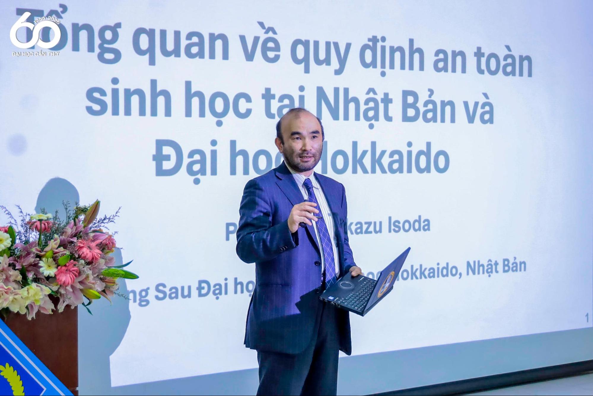 PGS.TS. Norikazu Isoda trình bày "Tổng quan về quy định an toàn sinh học tại Nhật Bản và Đại học Hokkaido"