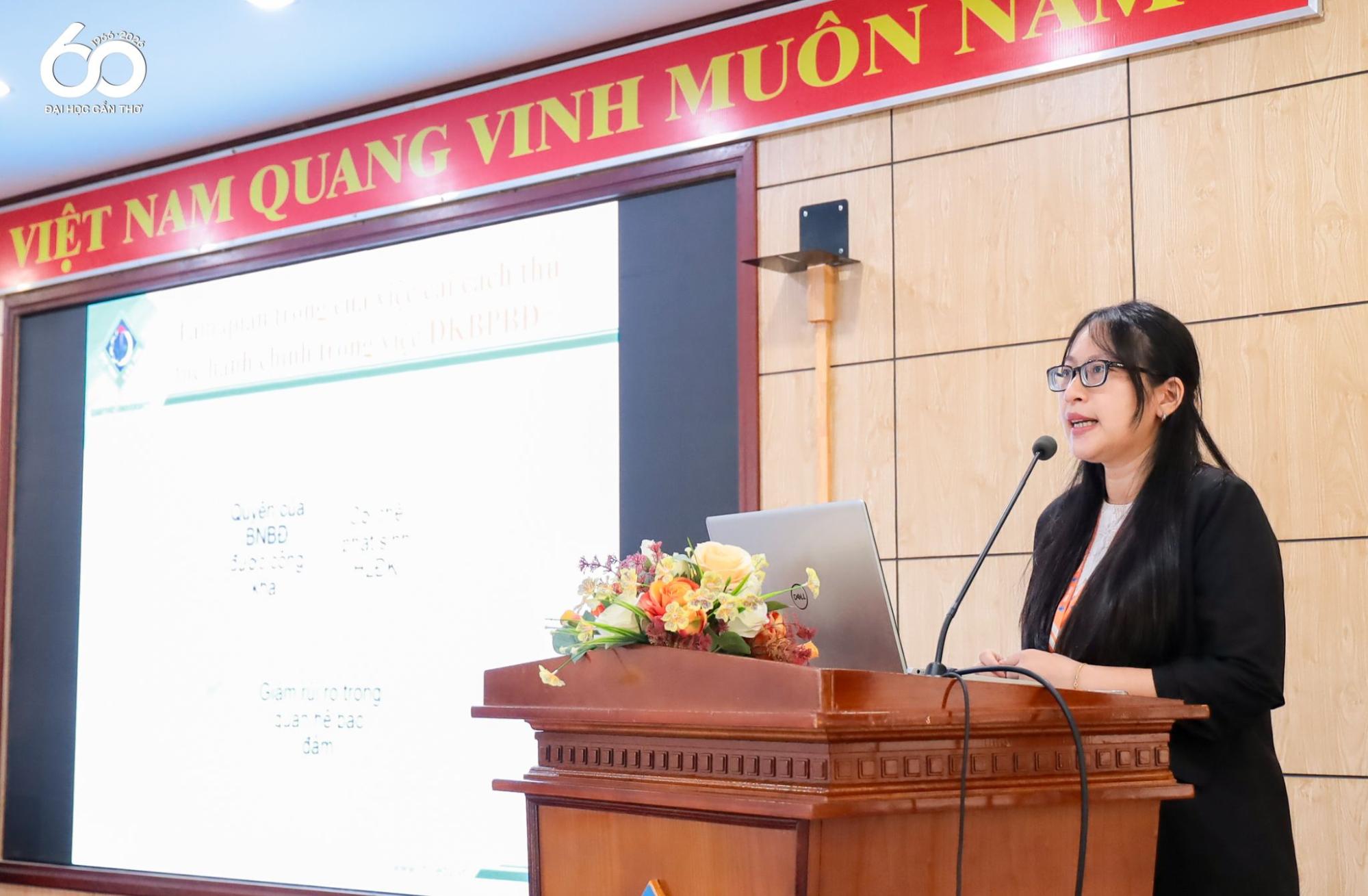 ThS. Trần Thị Cẩm Nhung - Giảng viên Khoa Luật, ĐHCT trình bày tham luận “Cải cách thủ tục hành chính trong đăng ký biện pháp bảo đảm thích ứng với mô hình chính quyền địa phương hai cấp”