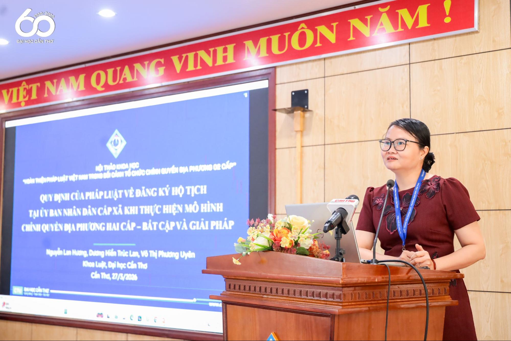 TS. Nguyễn Lan Hương - Trưởng phòng Pháp chế, ĐHCT trình bày tham luận “Quy định của pháp luật về đăng ký hộ tịch tại ủy ban nhân dân cấp xã khi thực hiện mô hình chính quyền địa phương hai cấp - Bất cập và giải pháp”