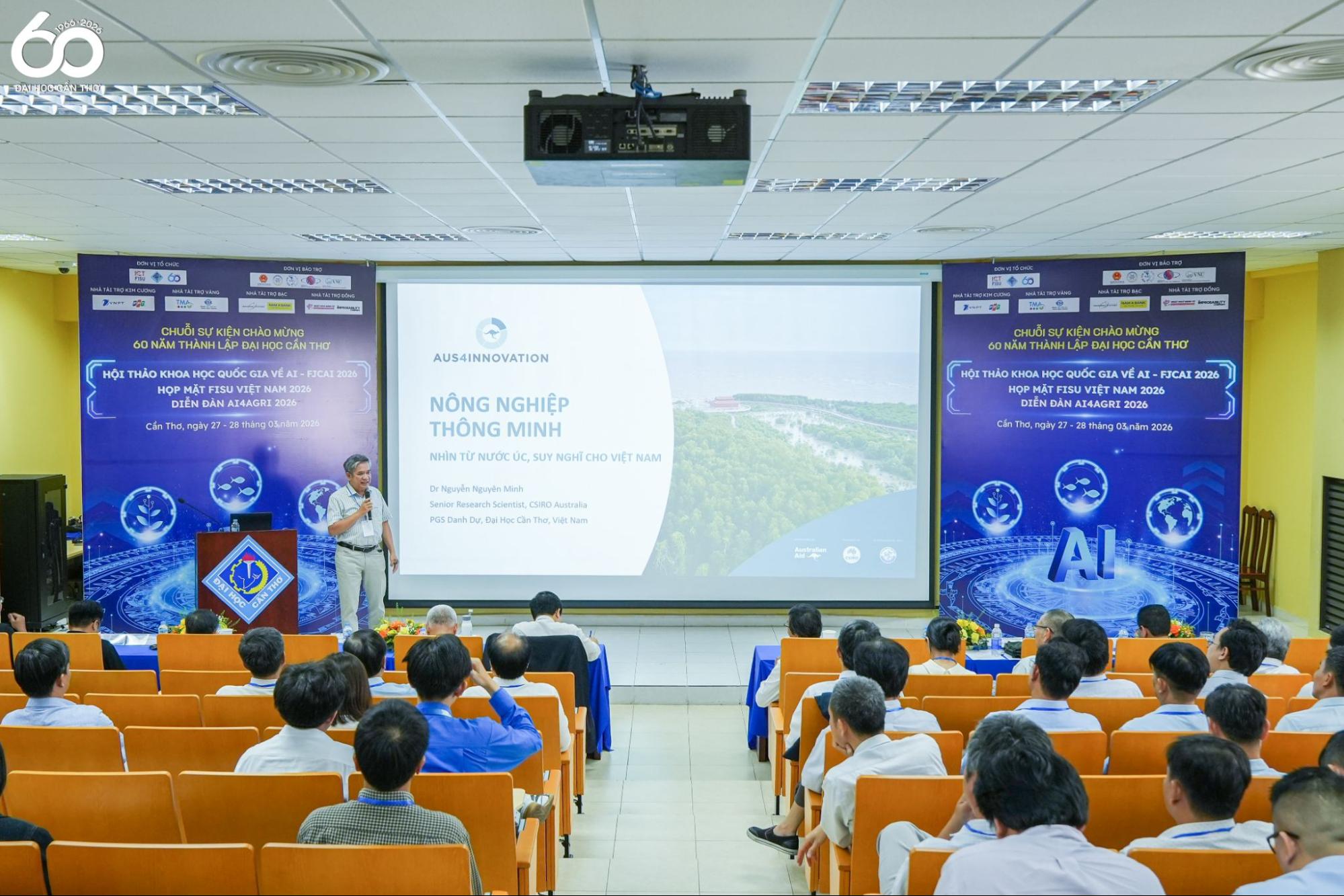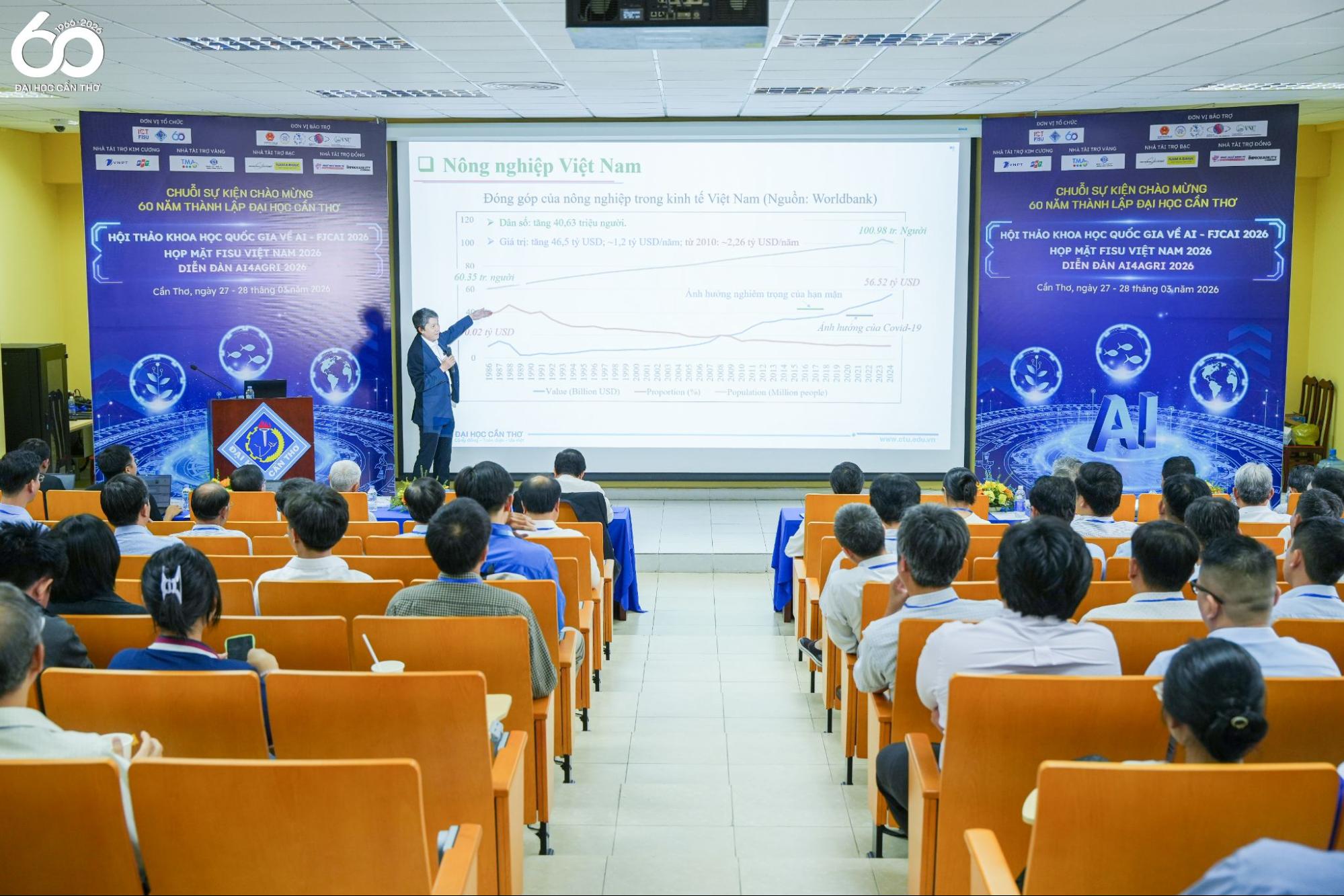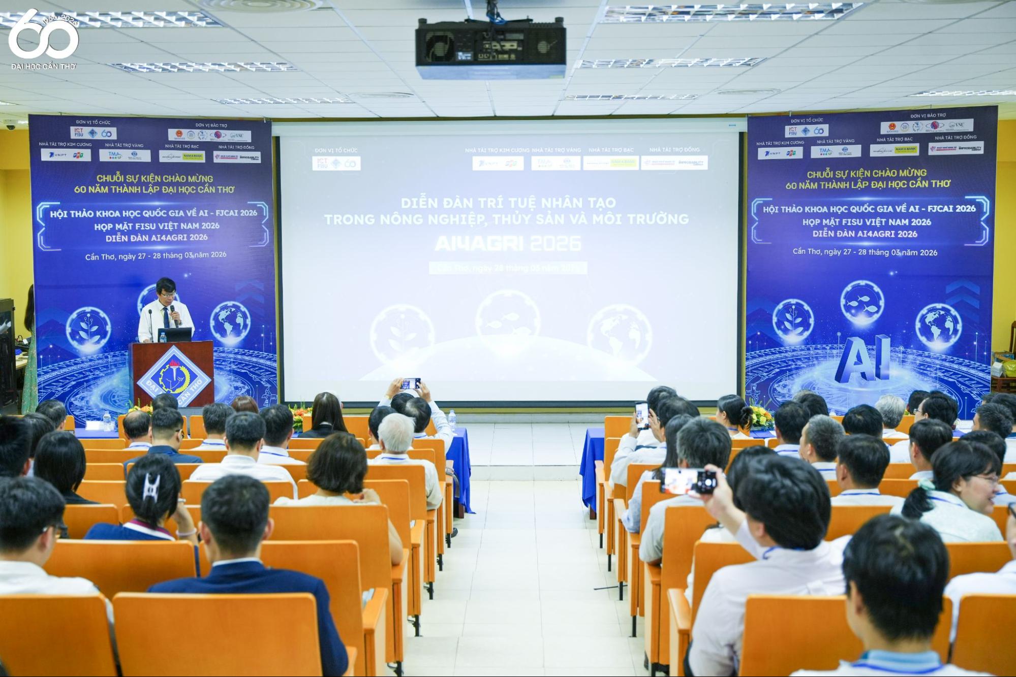 Trong khuôn khổ chuỗi Hội thảo khoa học Quốc gia về Trí tuệ nhân tạo (FJCAI 2026), sáng ngày 28/3/2026, Diễn đàn “Trí tuệ nhân tạo trong Nông nghiệp, Thủy sản và Môi trường” (AI4AGRI 2026) được Đại học Cần Thơ (ĐHCT) phối hợp cùng Câu lạc bộ Khoa – Trường – Viện Công nghệ Thông tin và Truyền thông (FISU) Việt Nam tổ chức. Đây không chỉ là một diễn đàn học thuật mang tính định hướng mà còn là không gian kết nối đa phương giữa nhà quản lý, nhà khoa học và doanh nghiệp, nhằm tìm kiếm những giải pháp công nghệ đột phá, giải quyết các thách thức đặc thù của vùng Đồng bằng sông Cửu Long.
