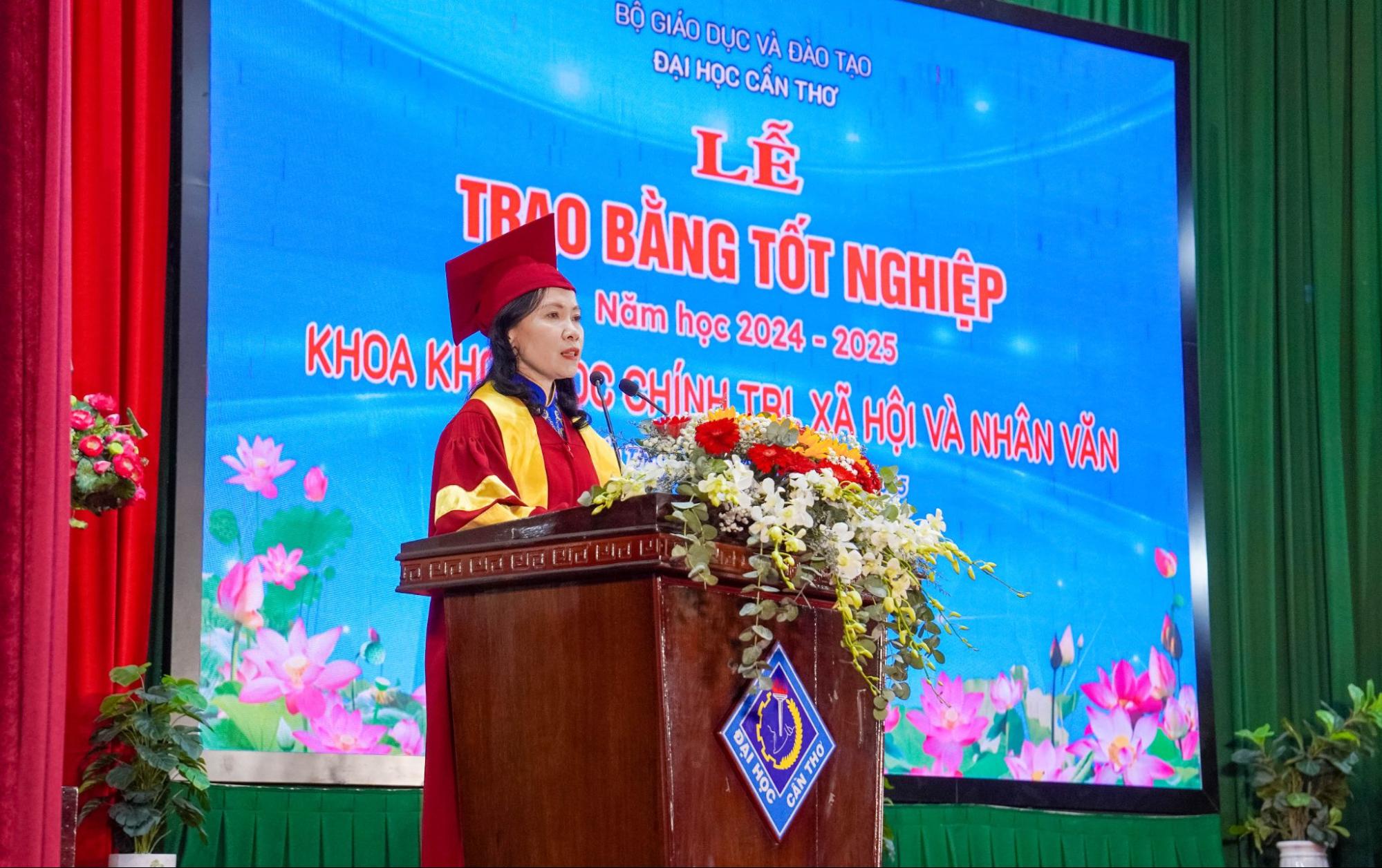 TS. Bùi Thanh Thảo - Trưởng Khoa Khoa học Chính trị, Xã hội và Nhân văn phát biểu tại lễ tốt nghiệp