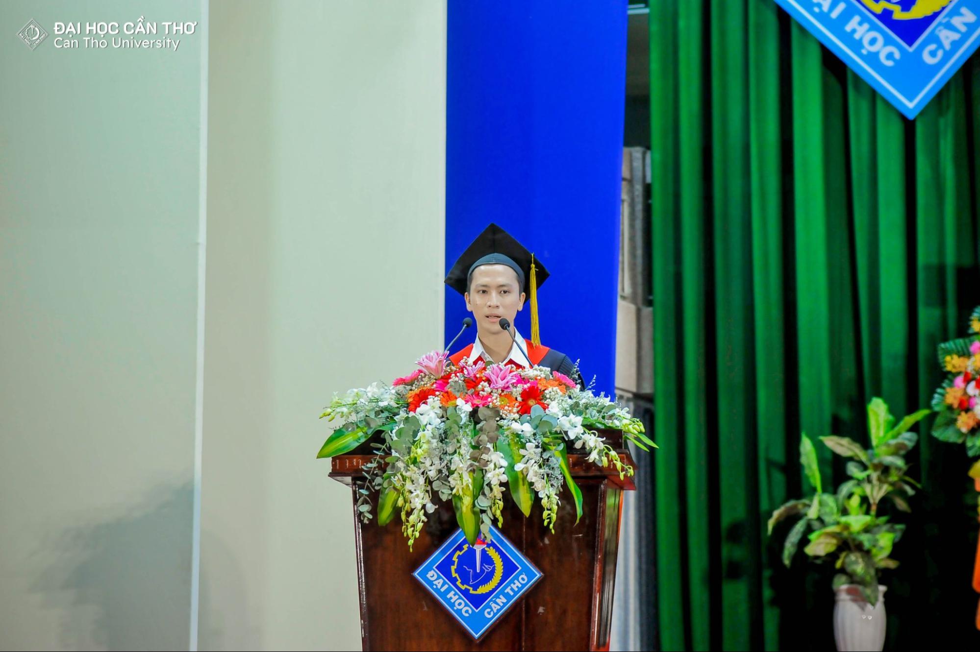 Các tân khoa đại diện cho sinh viên tốt nghiệp phát biểu cảm nghĩ, tri ân Thầy Cô giảng viên và gia đình tại lễ tốt nghiệp