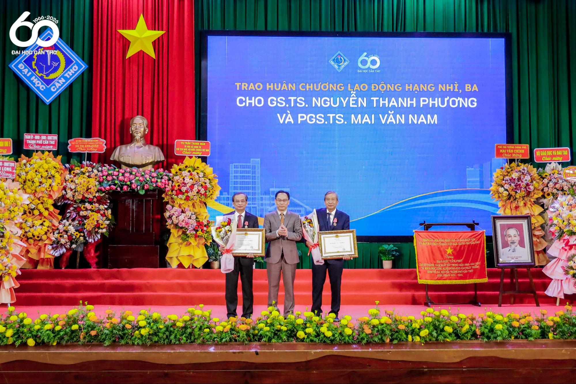 Nhân dịp trọng đại này, ĐHCT vinh dự được Ủy ban Nhân dân thành phố Cần Thơ cùng các tỉnh An Giang, Cà Mau, Đồng Tháp, Vĩnh Long trao tặng Bức trướng và Bằng khen nhằm ghi nhận những đóng góp nổi bật của Nhà trường đối với sự phát triển chung của khu vực. Đặc biệt, trong khuôn khổ chương trình, đại diện Bộ Giáo dục và Đào tạo đã công bố Quyết định của Chủ tịch nước về việc trao huân chương lao động hạng Nhì cho GS.TS. Nguyễn Thanh Phương và Huân chương lao động hạng Ba cho PGS.TS. Mai Văn Nam vì thành tích xuất sắc trong công tác, góp phần vào sự nghiệp xây dựng chủ nghĩa xã hội, bảo vệ Tổ quốc