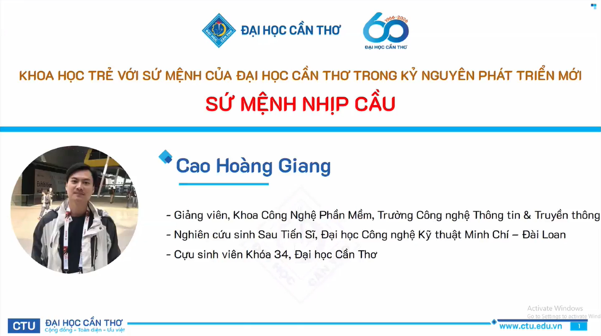TS. Cao Hoàng Giang - Trường Công nghệ Thông tin và Truyền thông, ĐHCT trình bày nội dung về Khoa học trẻ với sứ mệnh của Đại học Cần Thơ trong kỷ nguyên phát triển mới: Sứ mệnh nhịp cầu
